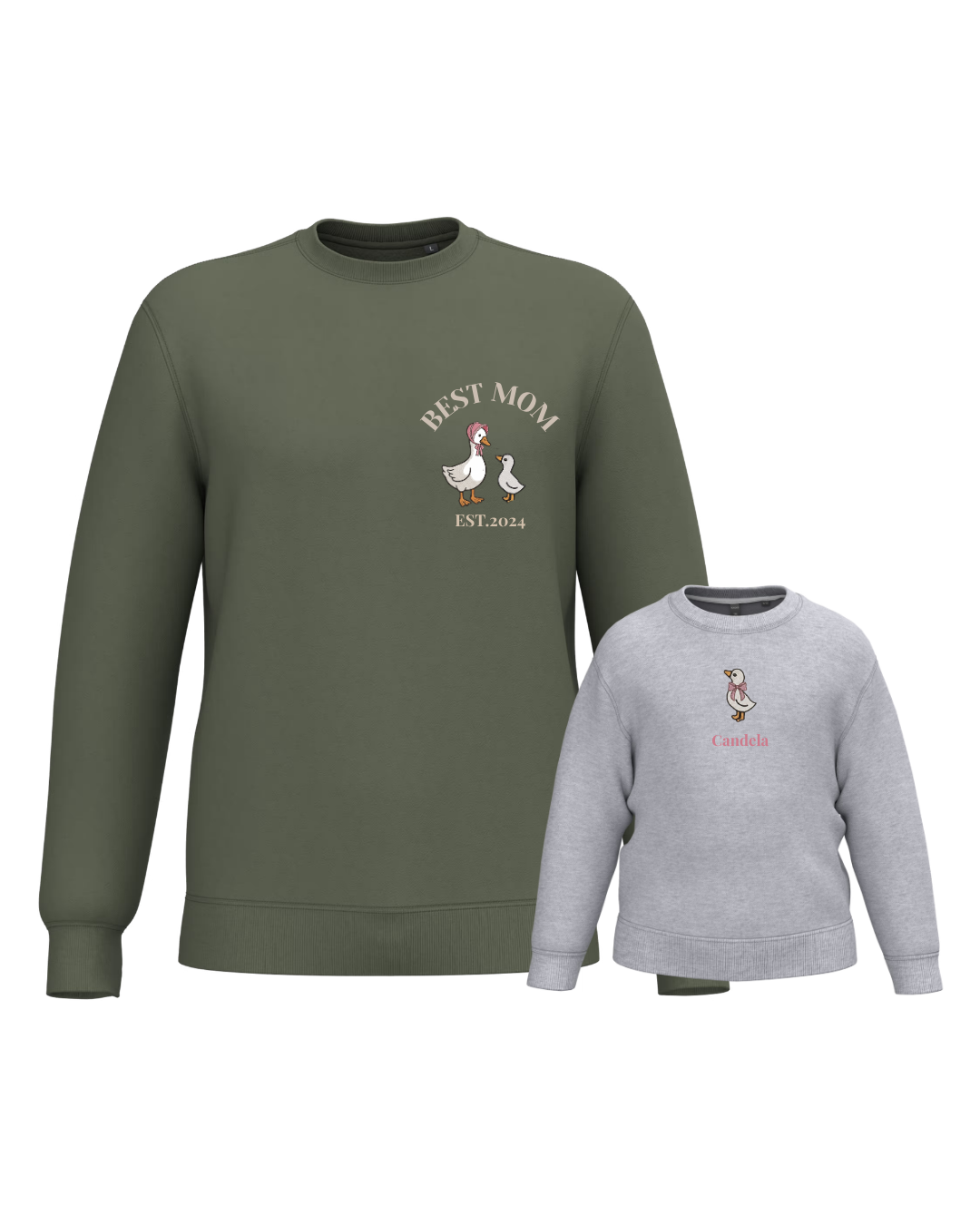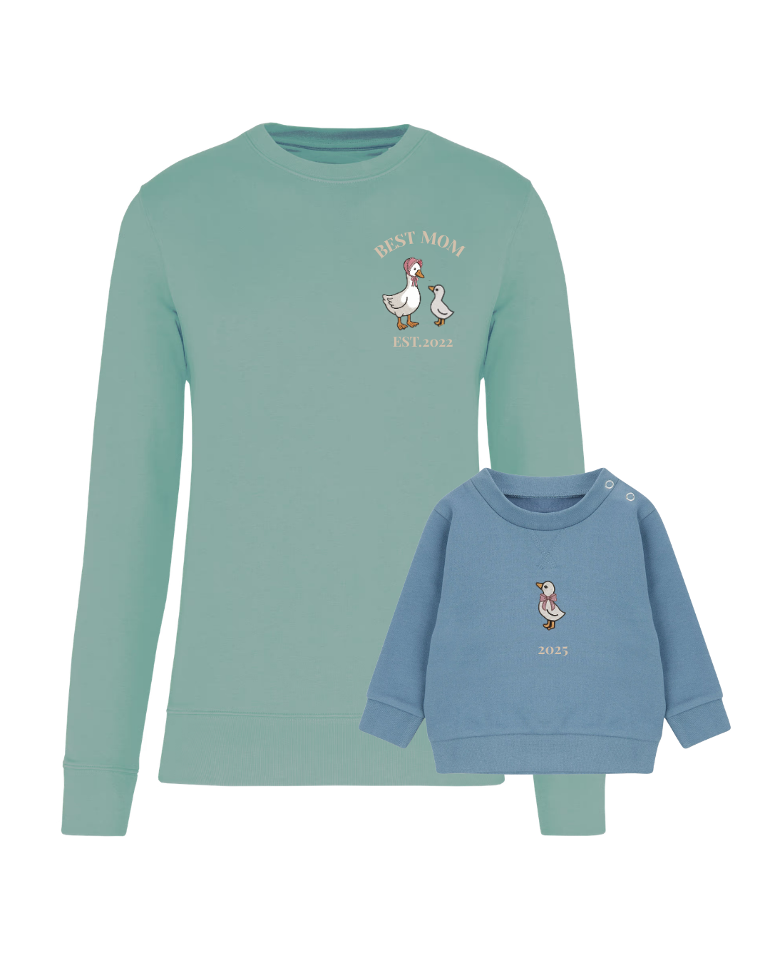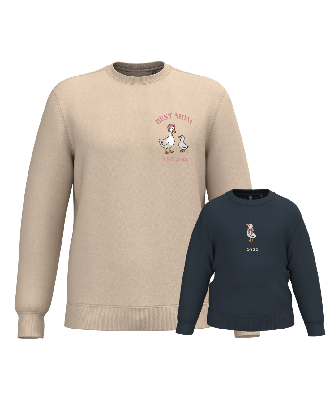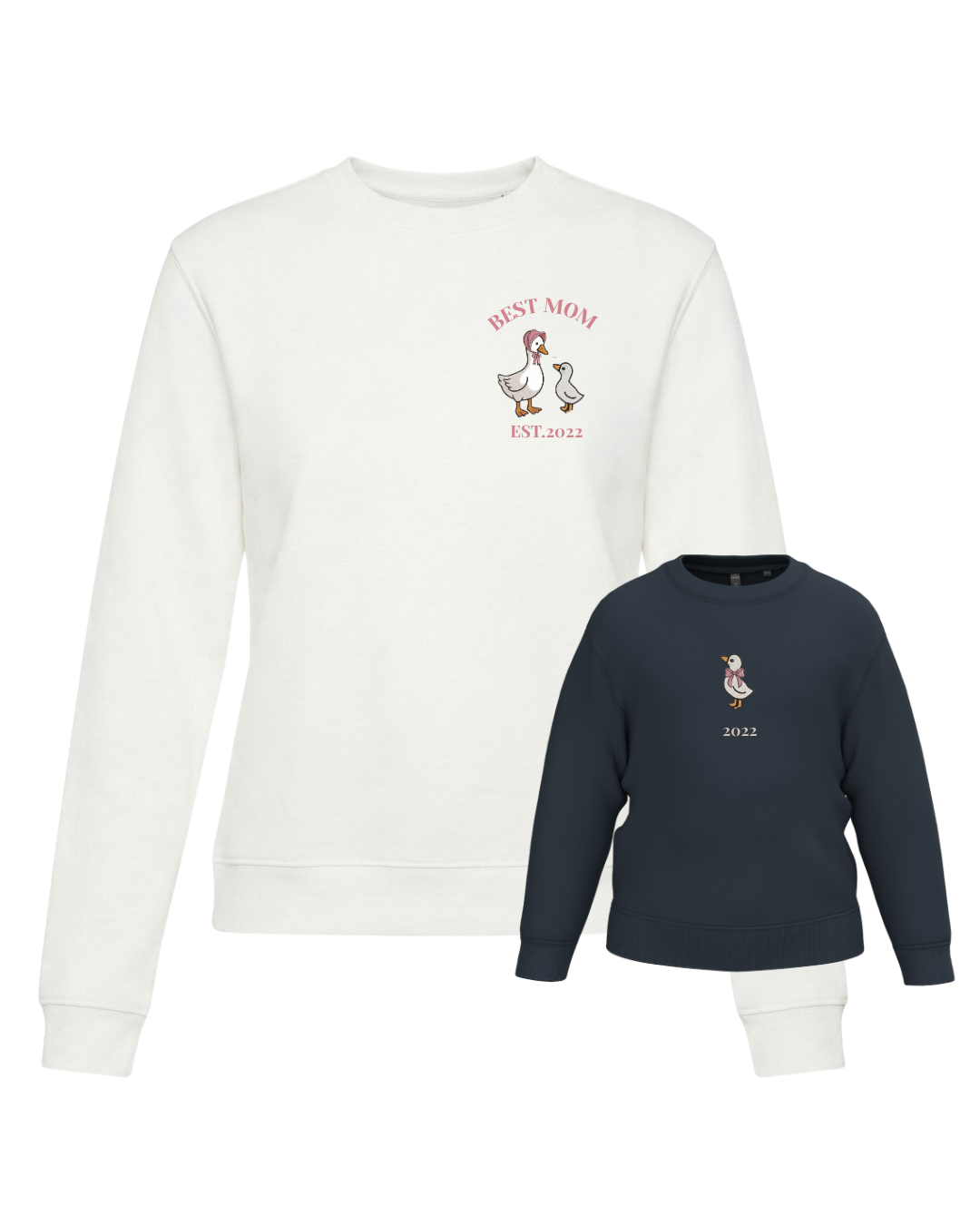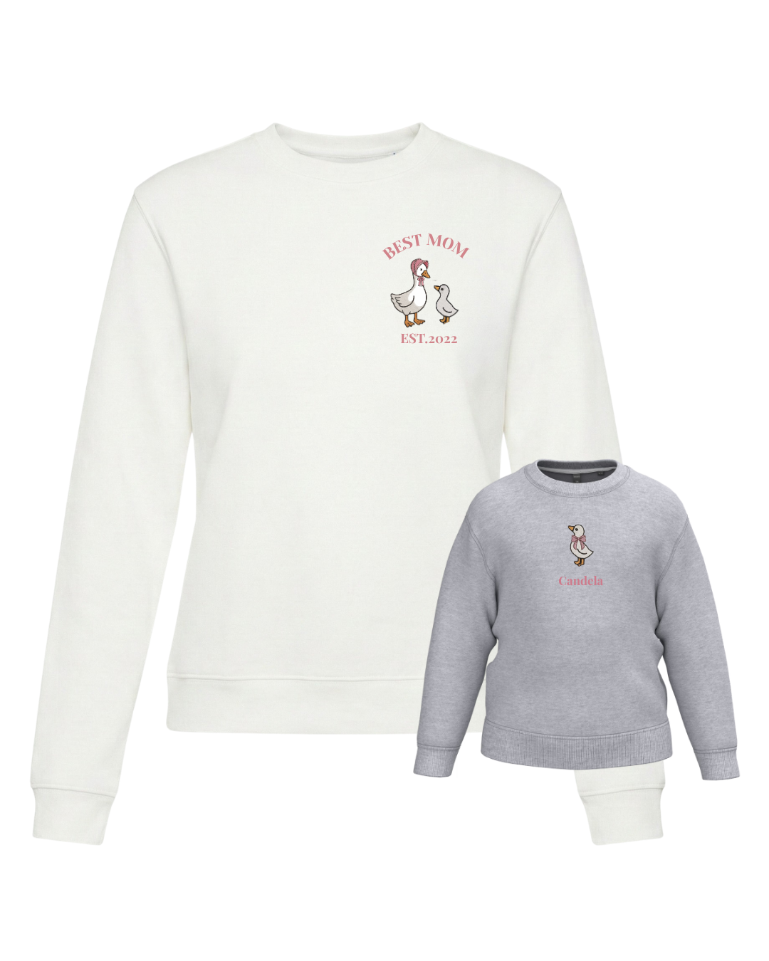 A unisex or women’s sweatshirt customised with a mum duck and one, two or three baby ducklings, along with two phrases (one at the top and the other at the bottom). A children’s hoodie customised with a boy or girl duck and a phrase underneath.