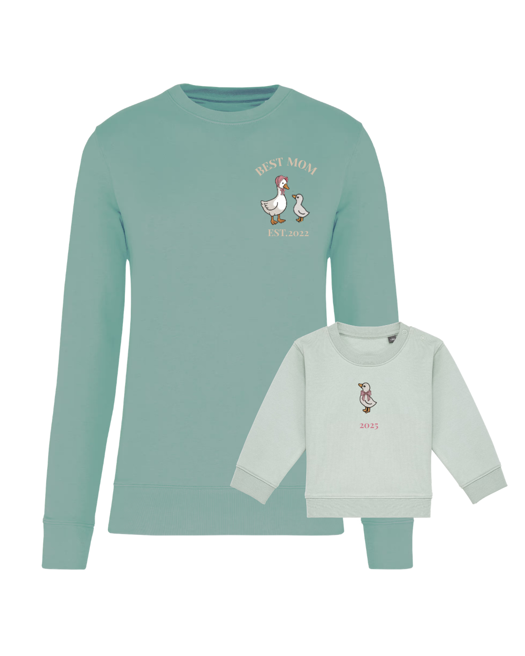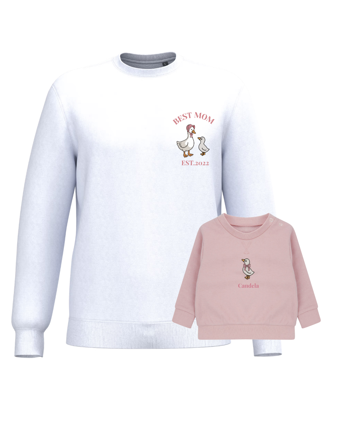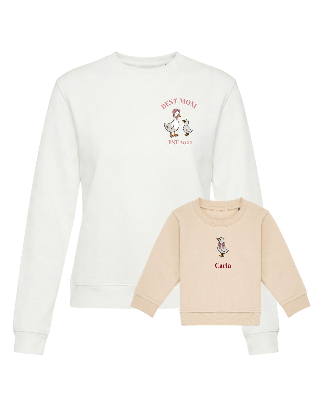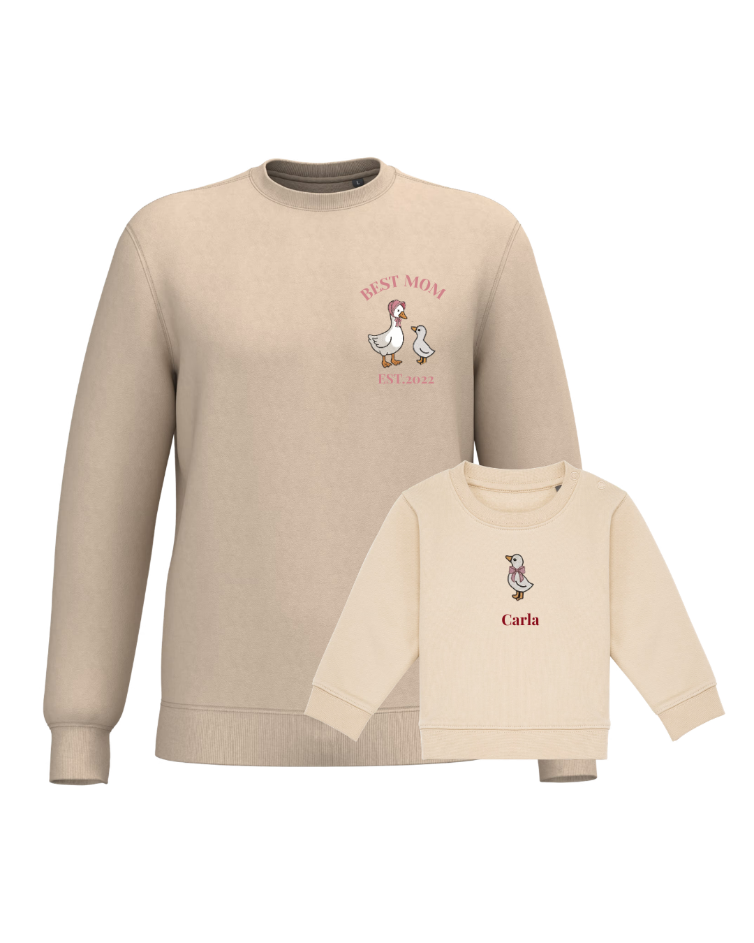 A unisex or women’s sweatshirt customised with a mum duck and one, two or three baby ducklings, along with two phrases (one at the top and the other at the bottom). A children’s hoodie customised with a boy or girl duck and a phrase underneath.