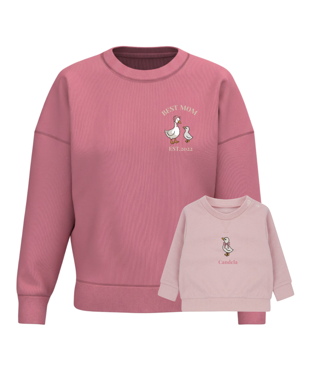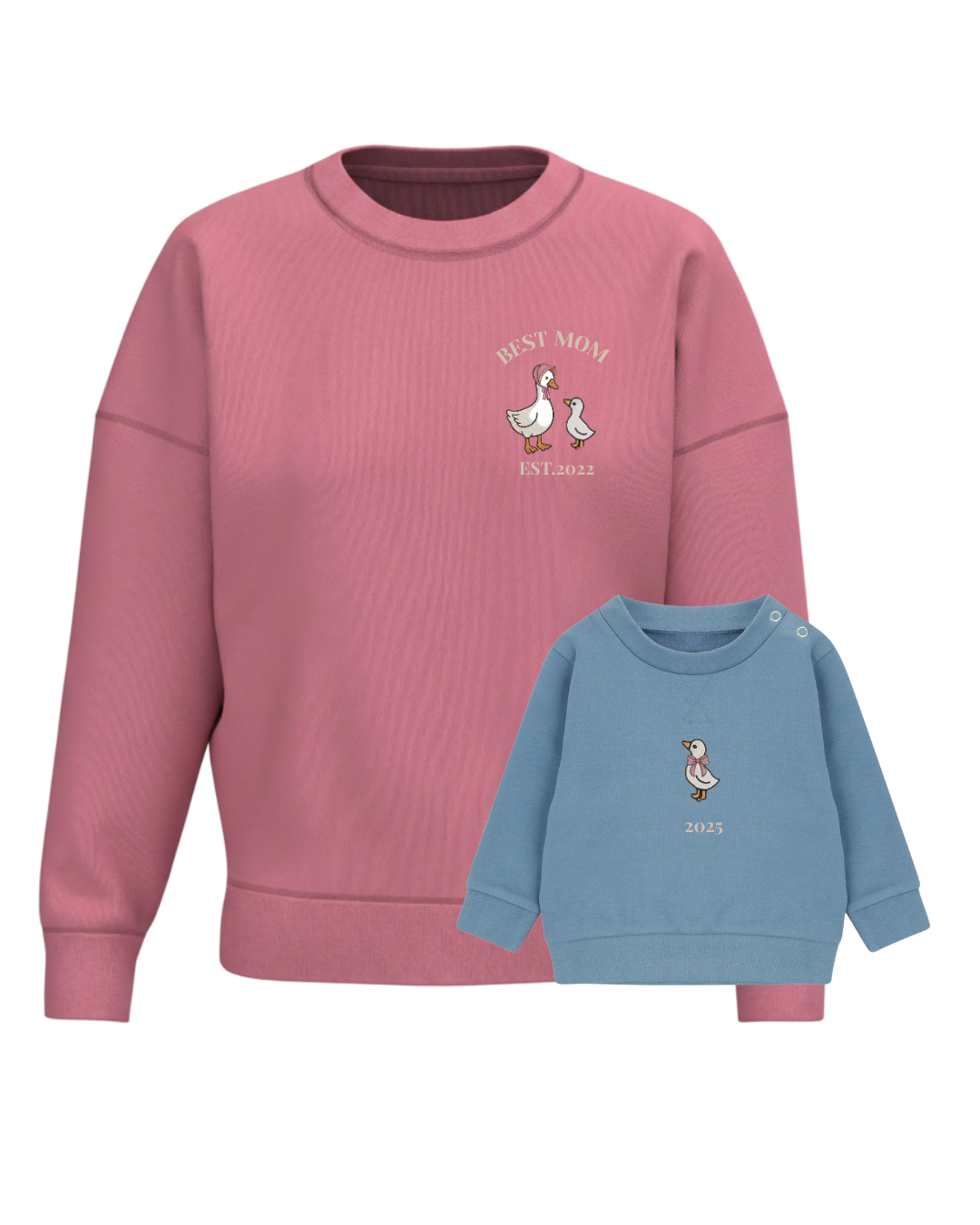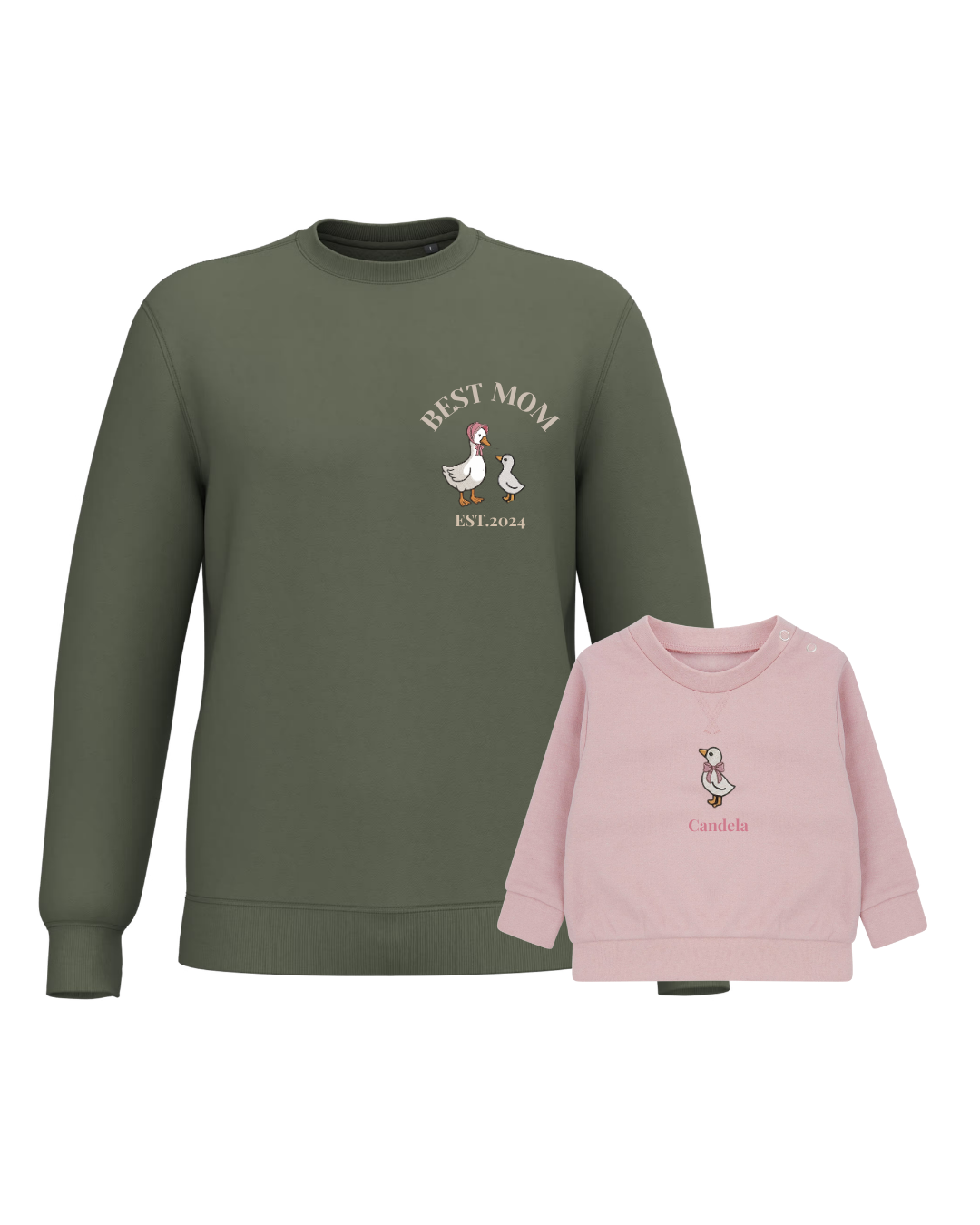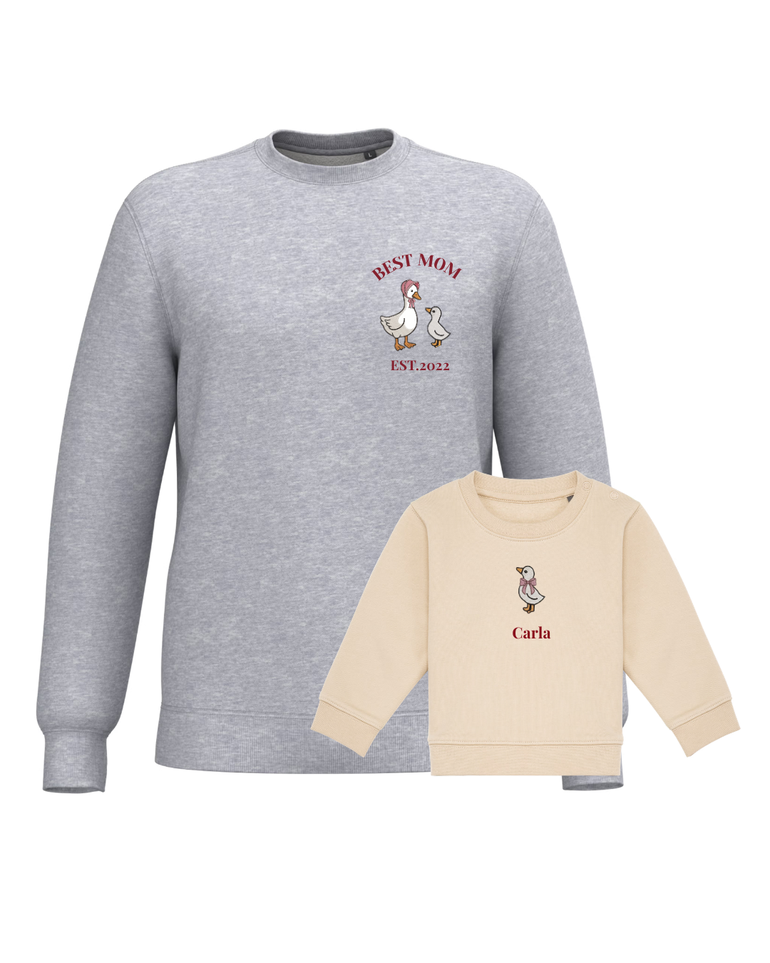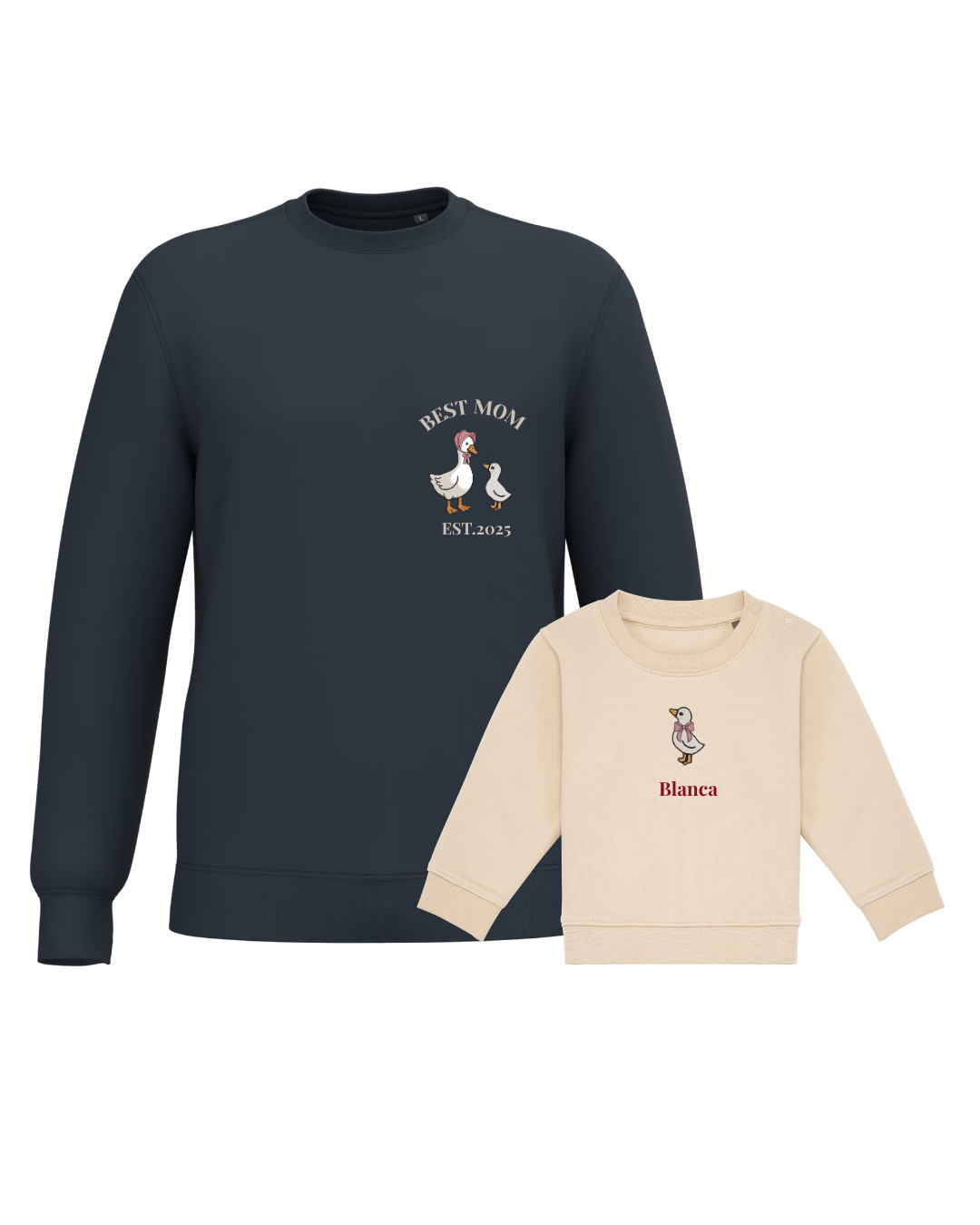 A unisex or women’s sweatshirt customised with a mum duck and one, two or three baby ducklings, along with two phrases (one at the top and the other at the bottom). A children’s hoodie customised with a boy or girl duck and a phrase underneath.