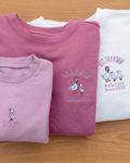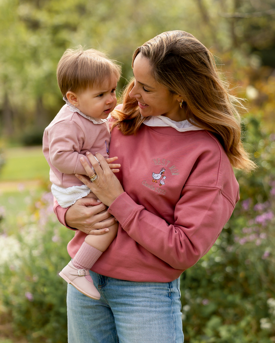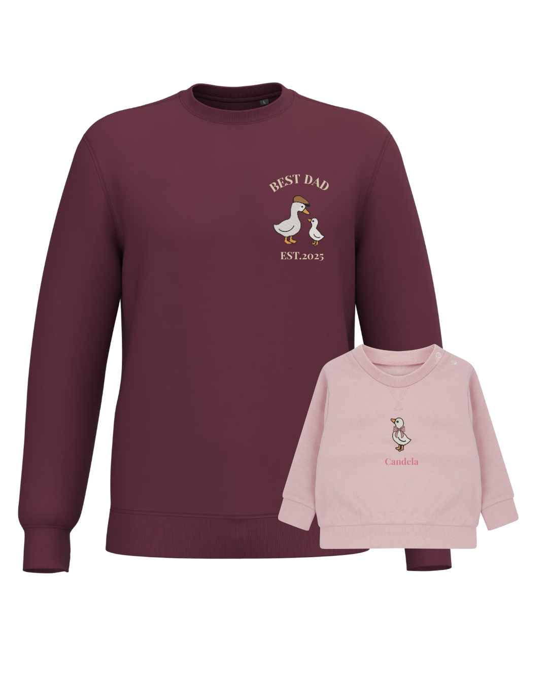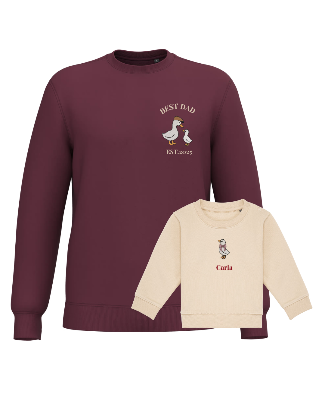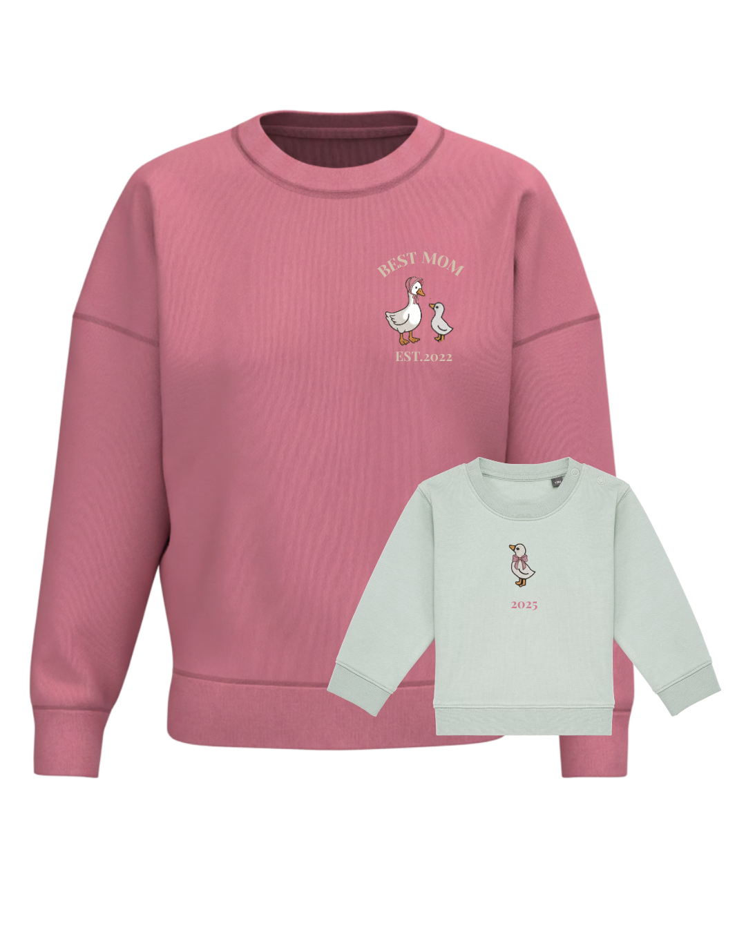 A unisex or women’s sweatshirt customised with a mum duck and one, two or three baby ducklings, along with two phrases (one at the top and the other at the bottom). A children’s hoodie customised with a boy or girl duck and a phrase underneath.