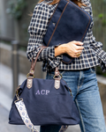 Personalized Dark Blue canvas case with chocolate brown leather details. It features an exterior pocket. Lined inside with ecru fabric. It features a gold zipper with a puller.
