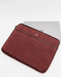 Personalized maroon canvas case with chocolate brown leather details. It features an exterior pocket. Lined inside with ecru fabric. It features a gold zipper with a puller.