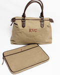 Made of taupe canvas with chocolate brown leather handles. A timeless staple that will never go out of style.