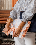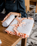 Case with floral fabric in shades of orange and blue. The sides of the zip have a ruffle with a gingham print in shades of orange.