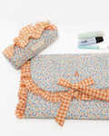 Personalised cover made of cotton fabric with small flowers in shades of blue and orange. Plain front and back in fabric with small flowers in shades of blue and orange. The front has a flap surrounded by an orange gingham frill and a matching bow.