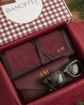 Rigid burgundy jewelry box with suede exterior combined with leather. Closes with two burgundy leather straps. Burgundy suede interior with two pockets (one with a zipper), two straps (one for rings and one for earrings) and various hooks for necklaces. Designed and produced in Barcelona.