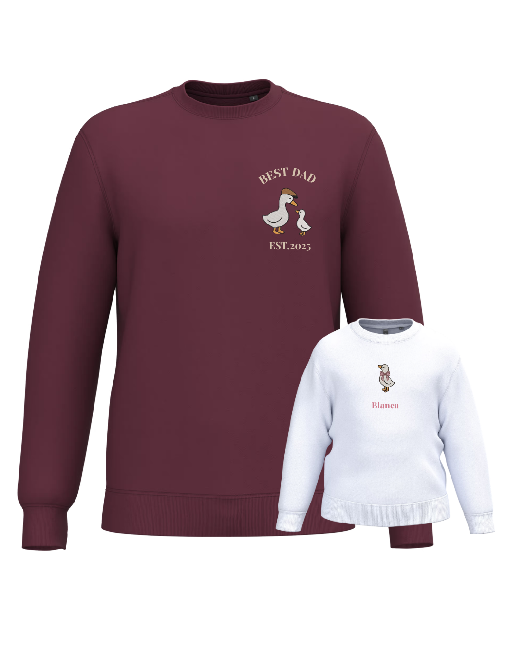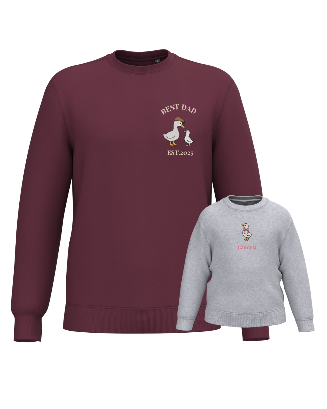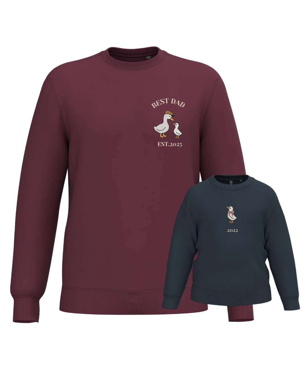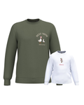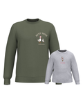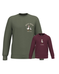 The embroidery is done on the left chest and back of the adult sweatshirt, and in the centre of the children's sweatshirt.