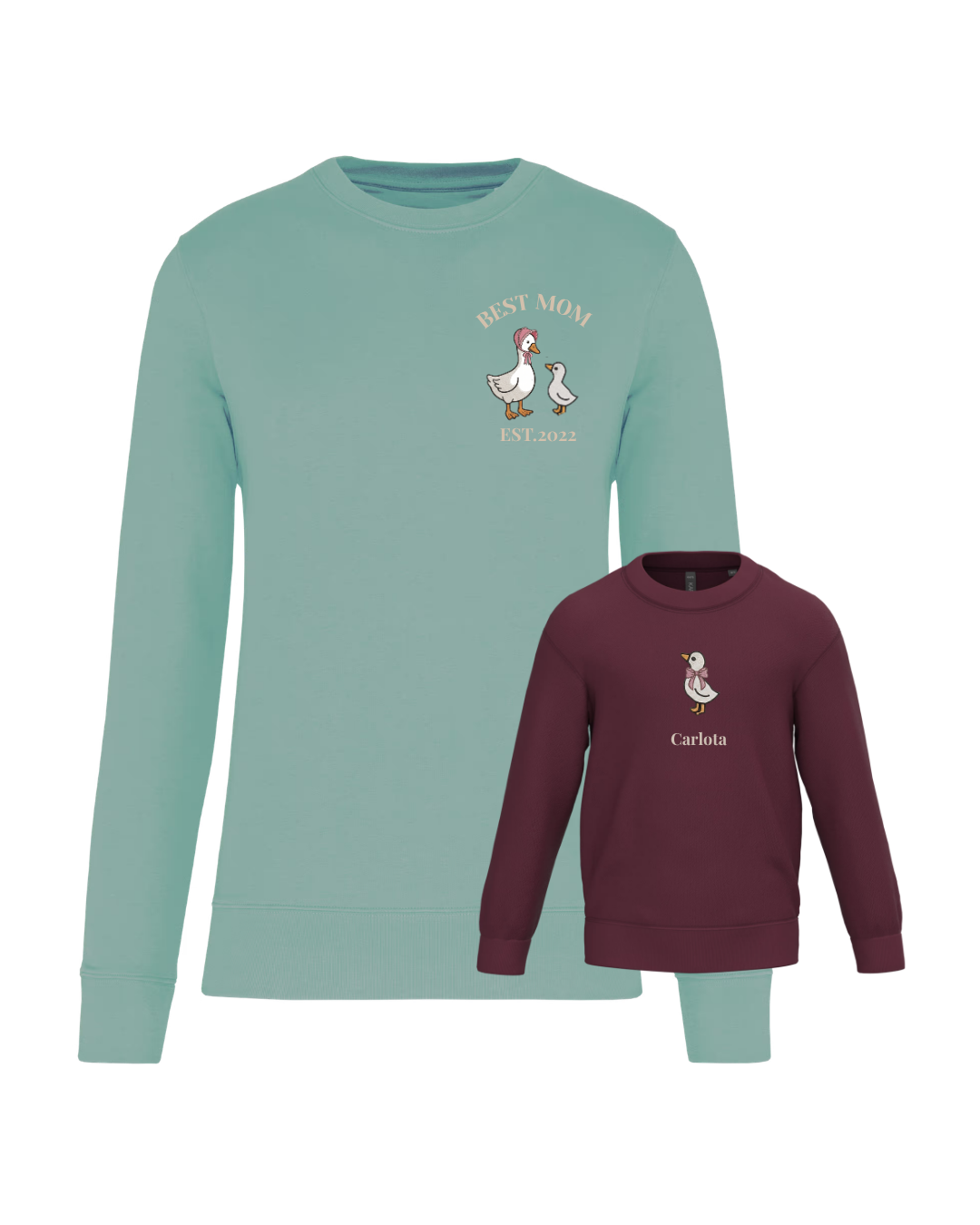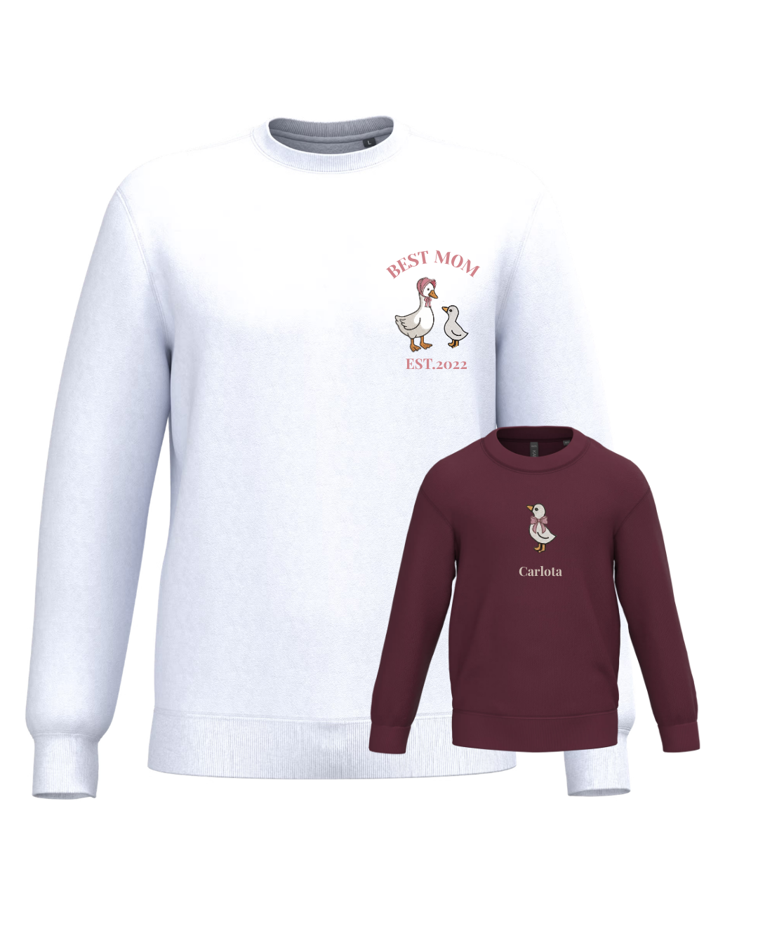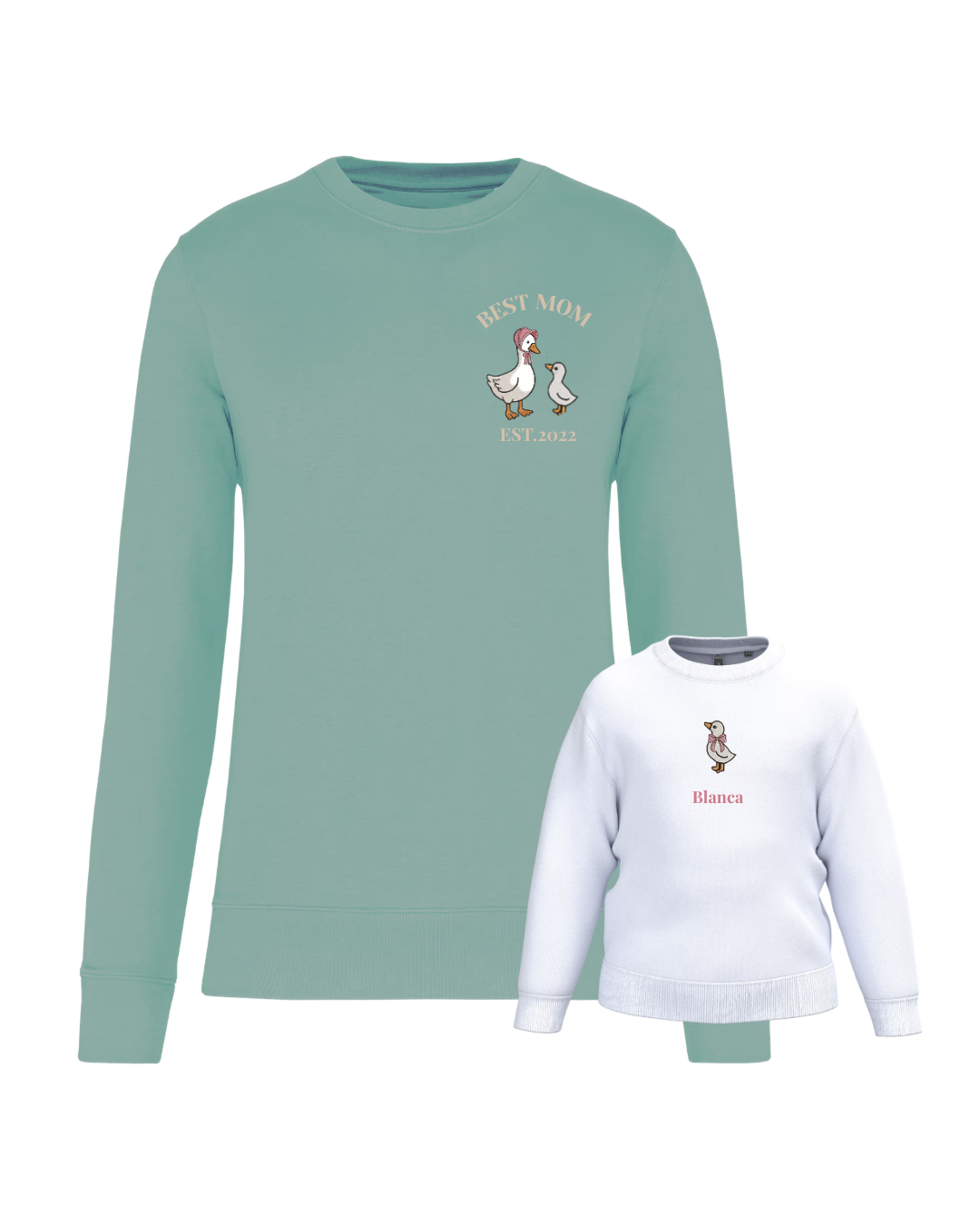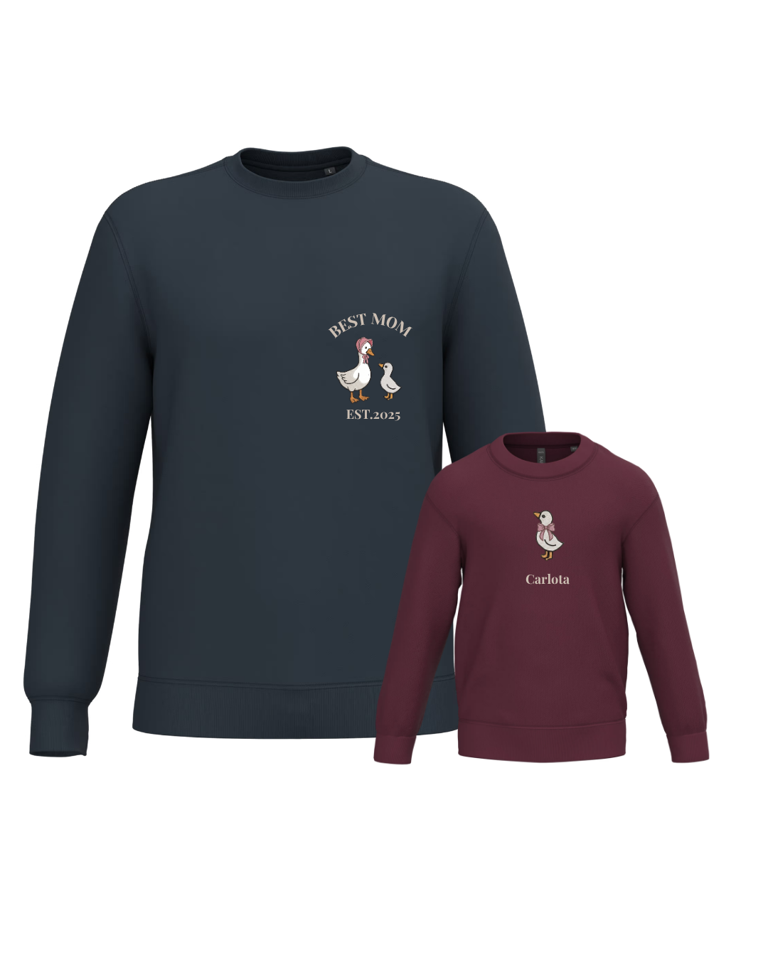 A unisex or women’s hoodie customised with a mum duck and one, two or three baby ducklings, along with two phrases (one at the top and the other at the bottom). A children’s hoodie customised with a boy or girl duck and a phrase underneath.