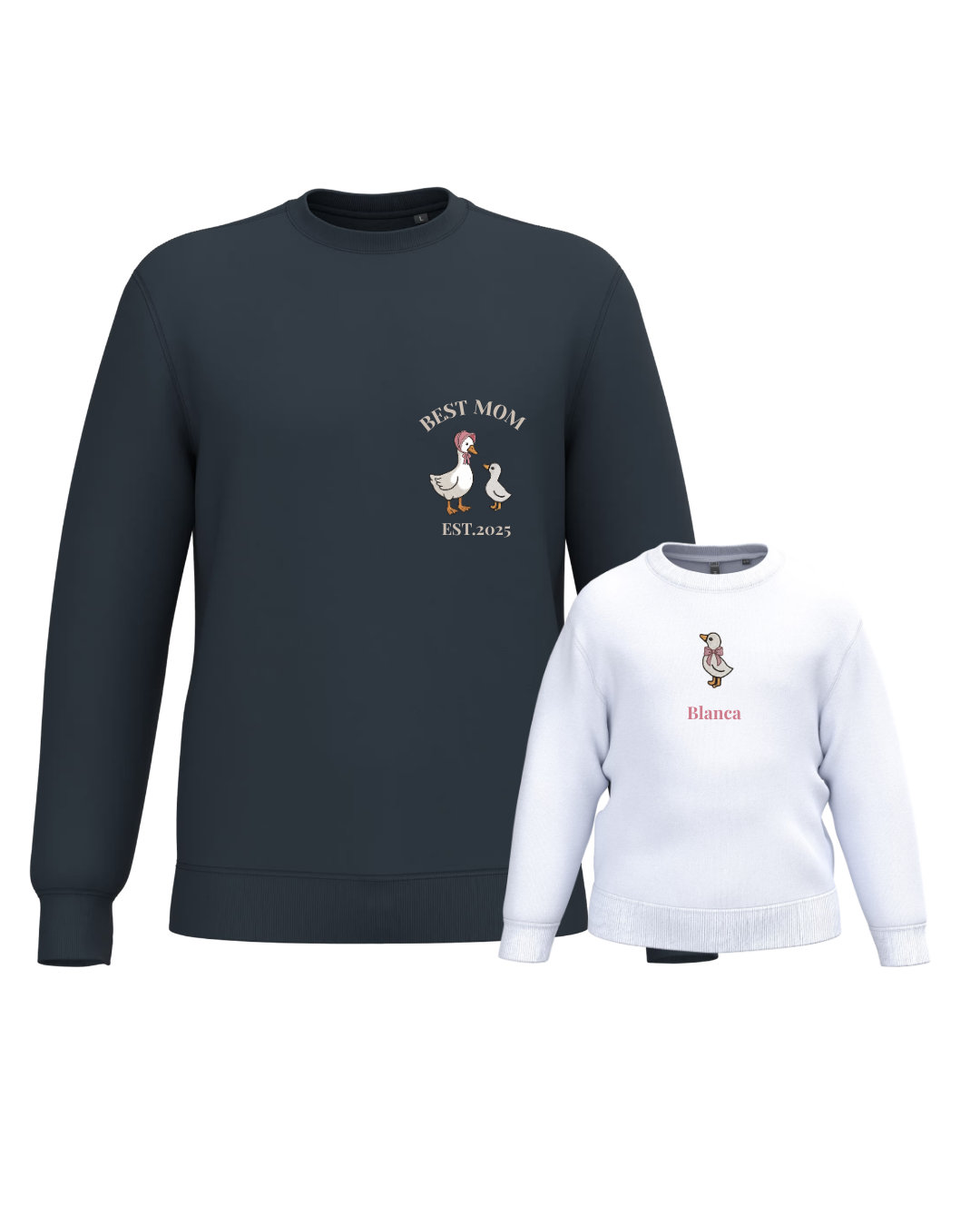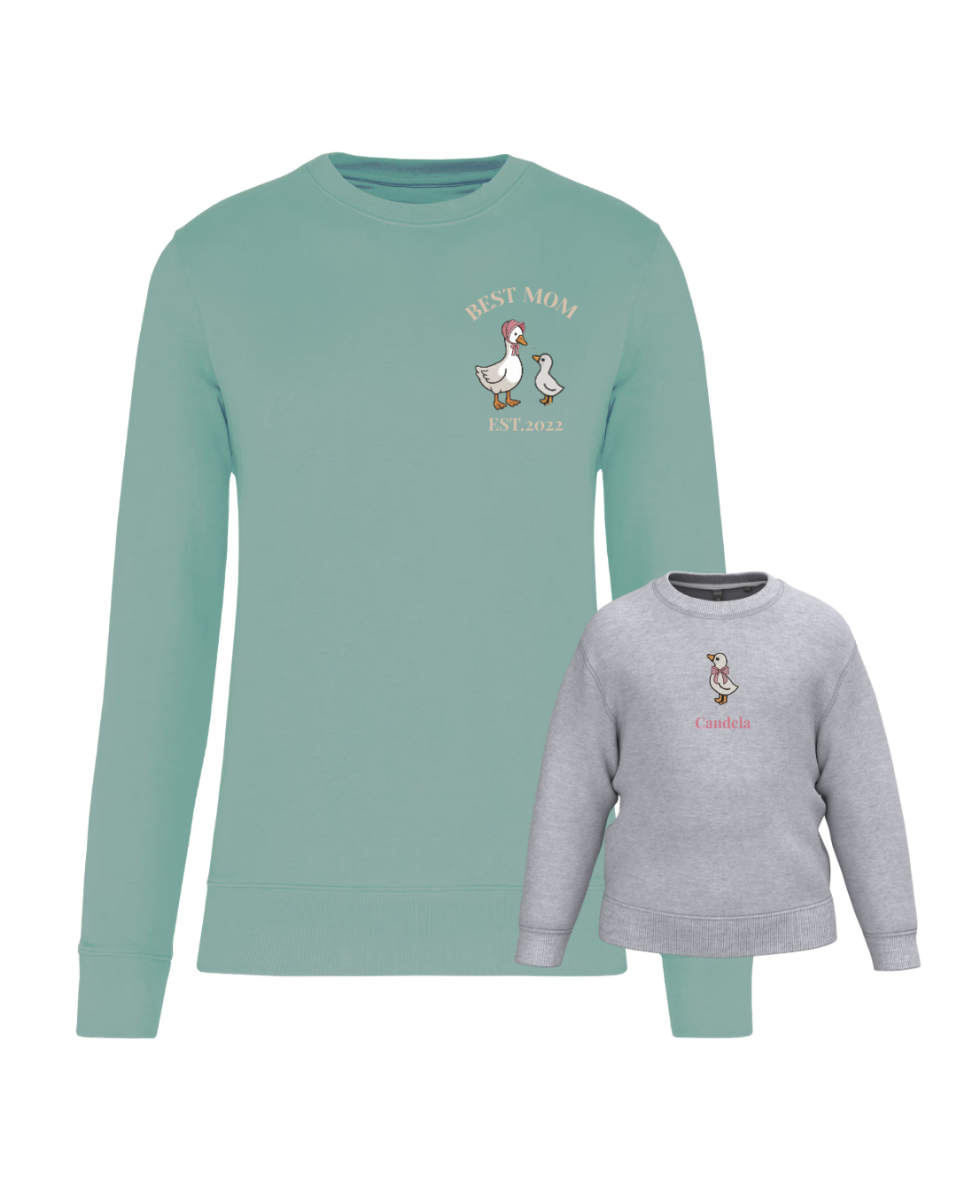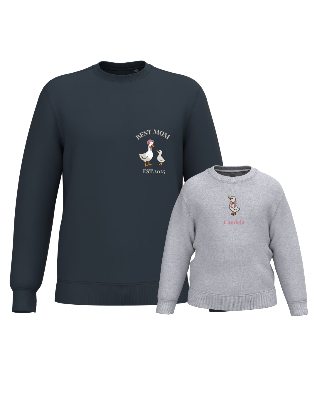 A unisex or women’s hoodie customised with a mum duck and one, two or three baby ducklings, along with two phrases (one at the top and the other at the bottom). A children’s hoodie customised with a boy or girl duck and a phrase underneath.