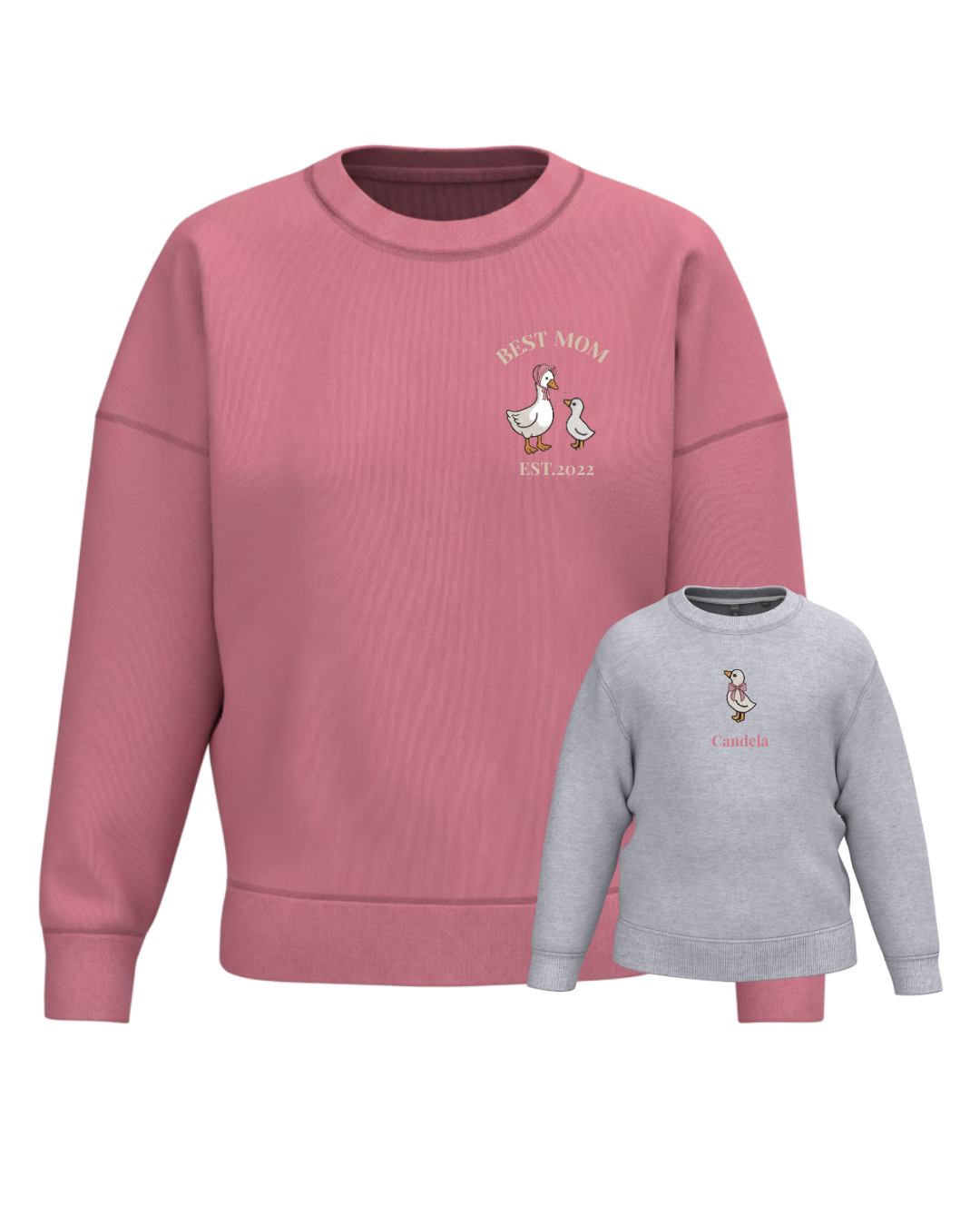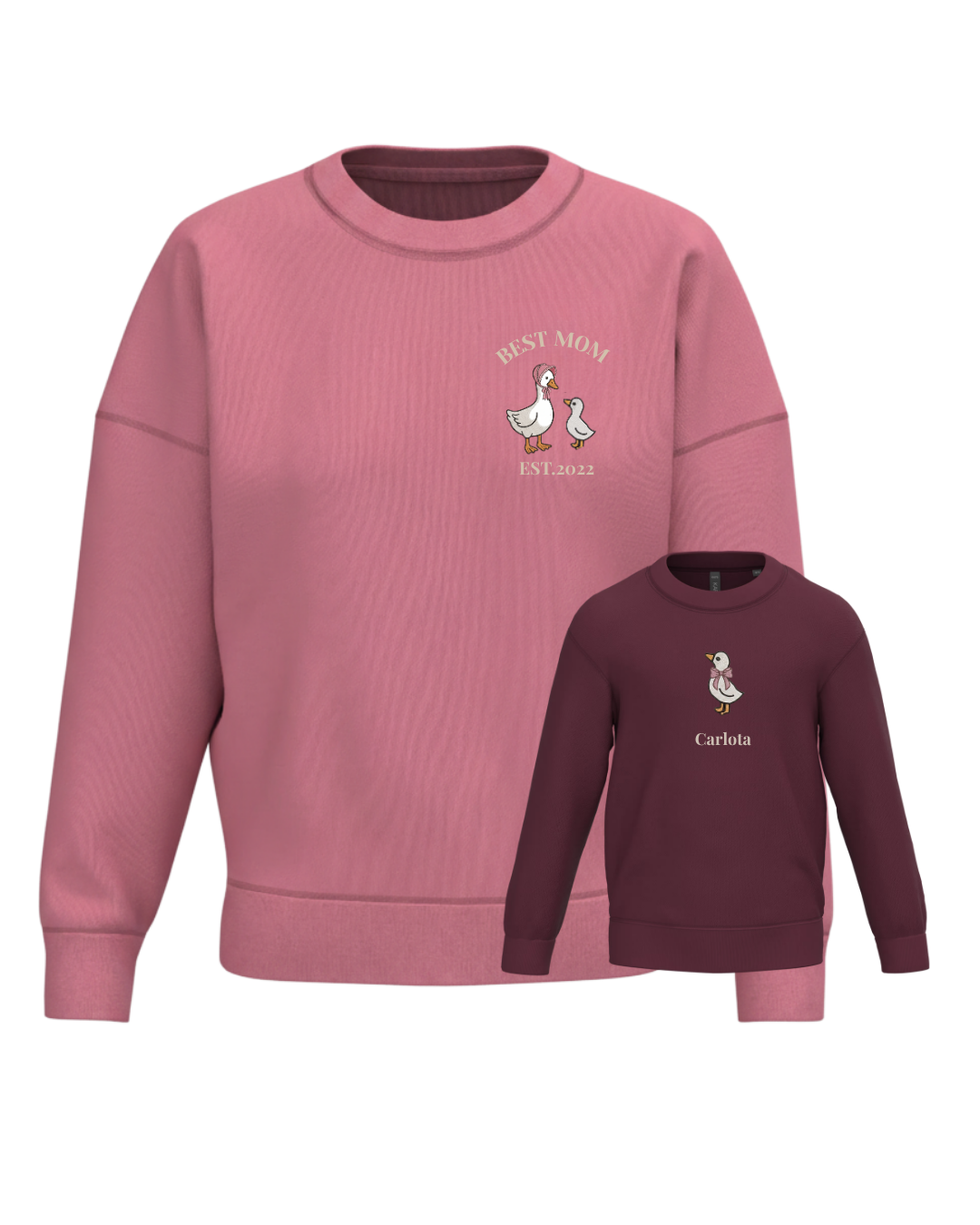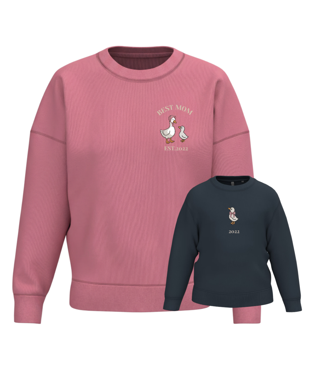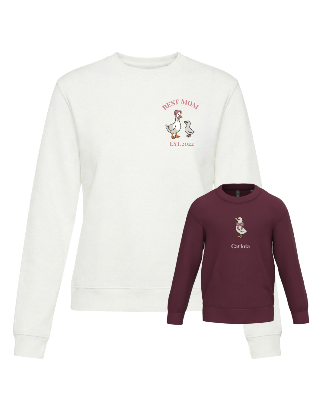 A unisex or women’s hoodie customised with a mum duck and one, two or three baby ducklings, along with two phrases (one at the top and the other at the bottom). A children’s hoodie customised with a boy or girl duck and a phrase underneath.