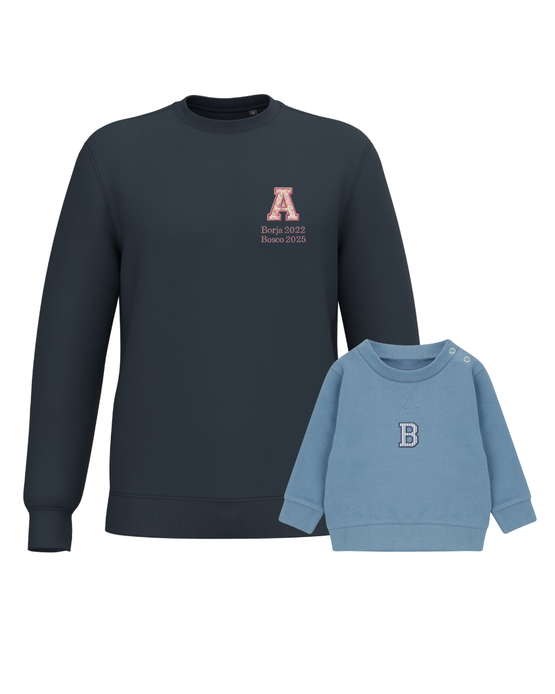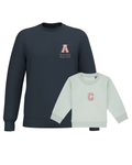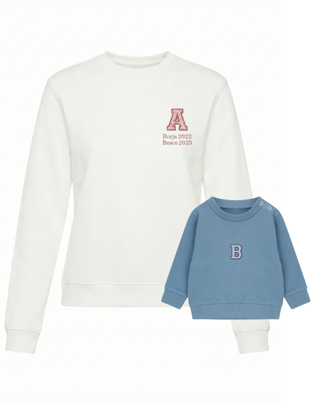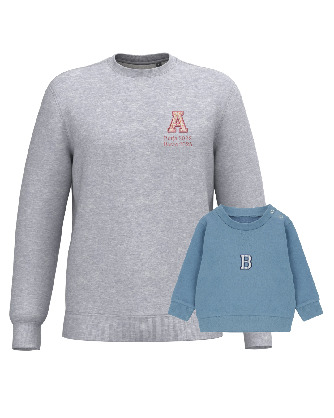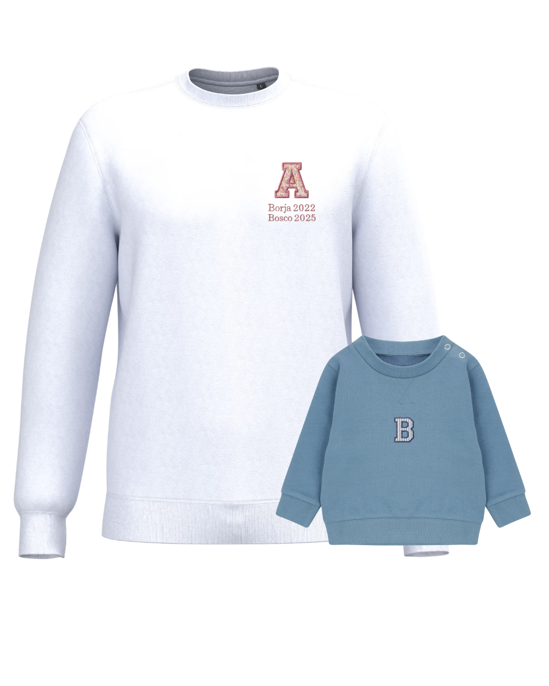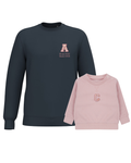 The embroidery is done on the left chest and back of the adult sweatshirt, and in the centre of the children's sweatshirt.