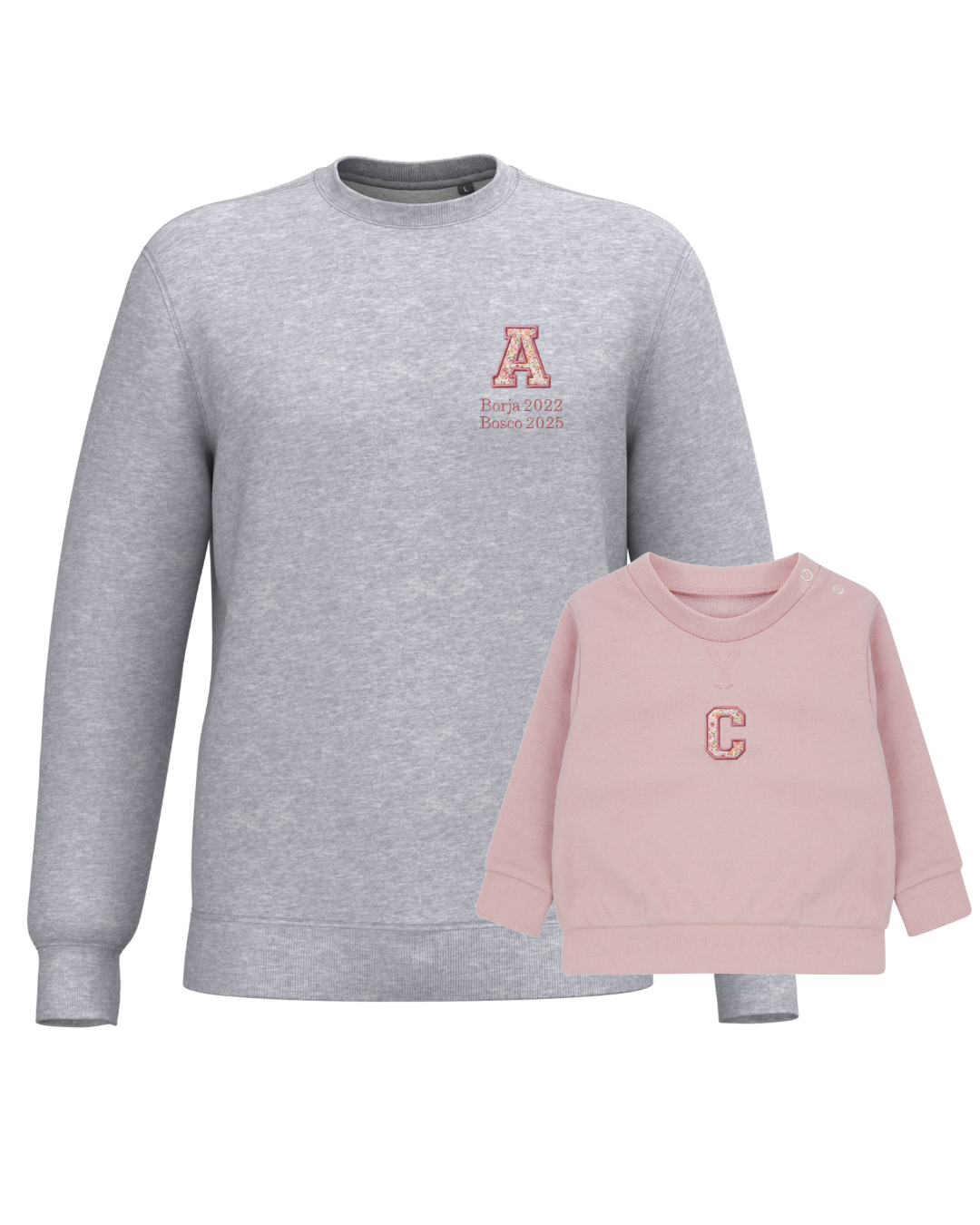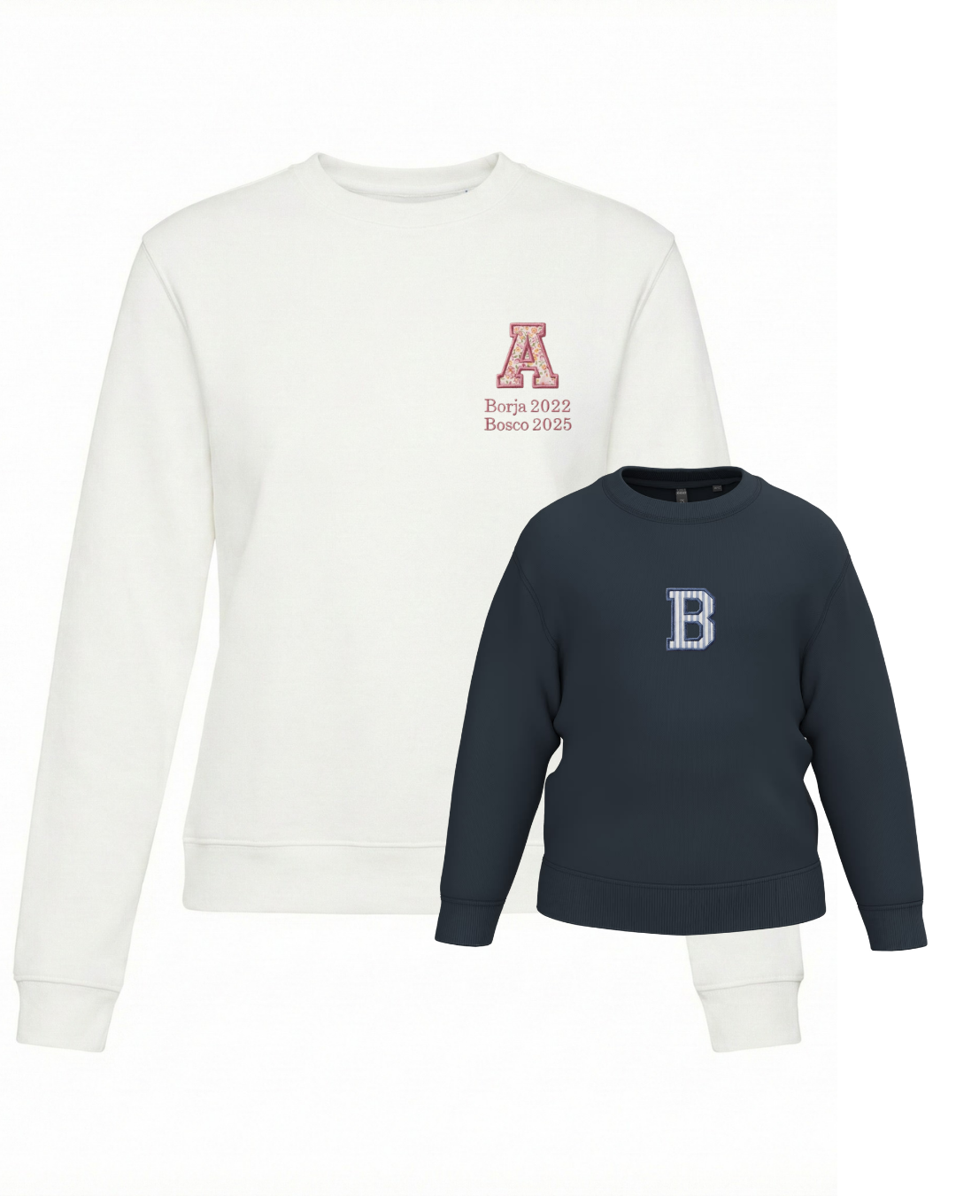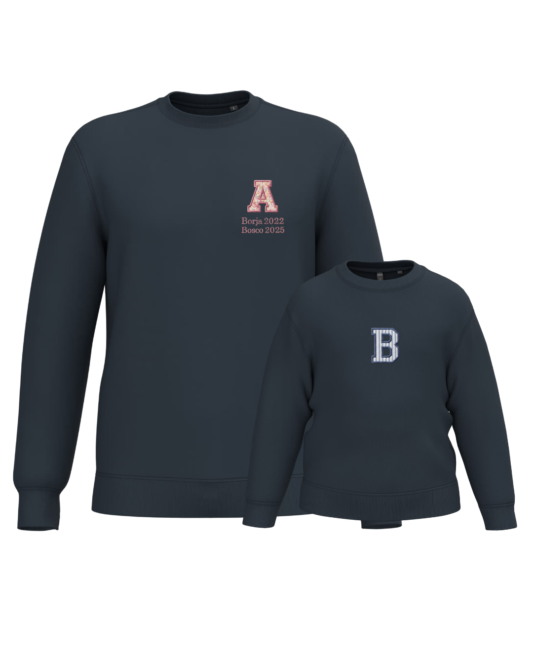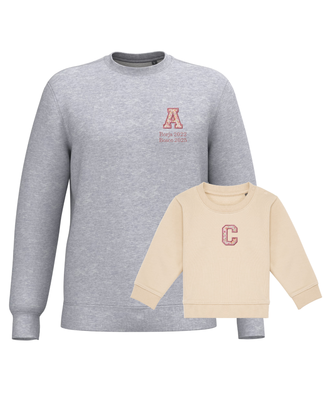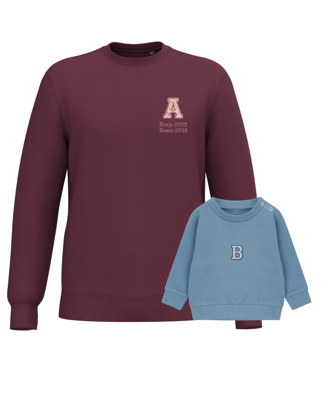 The embroidery is done on the left chest and back of the adult sweatshirt, and in the centre of the children's sweatshirt.
