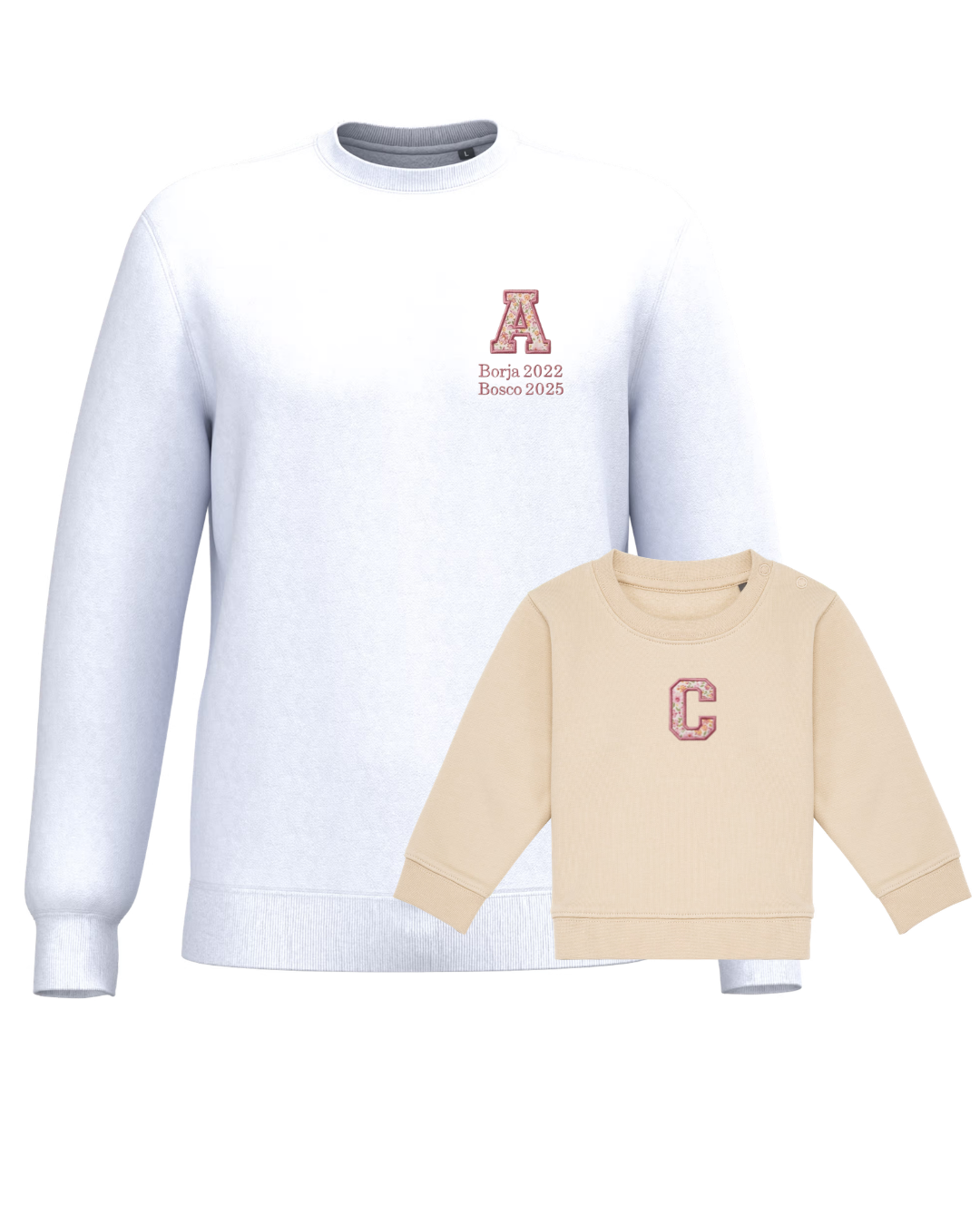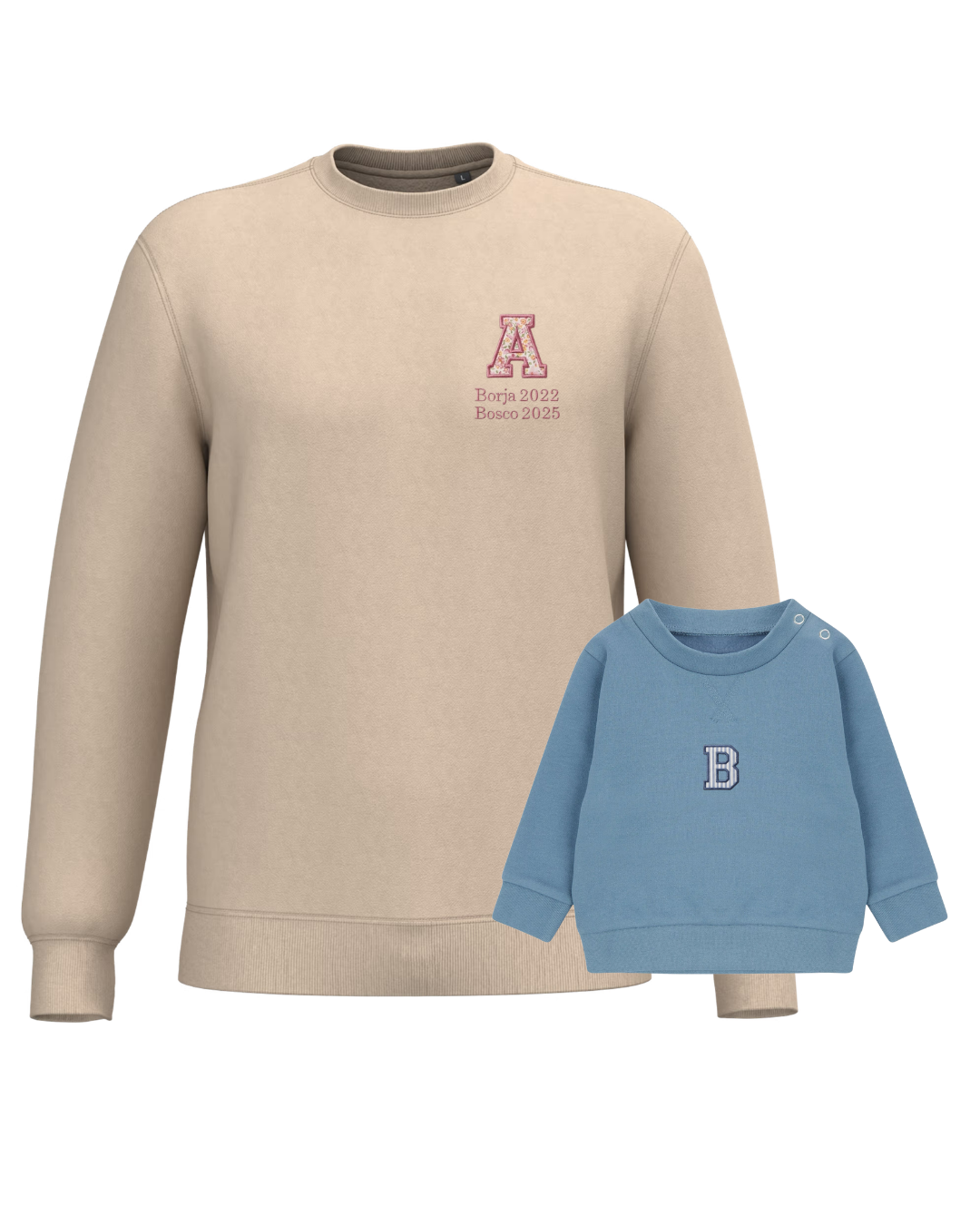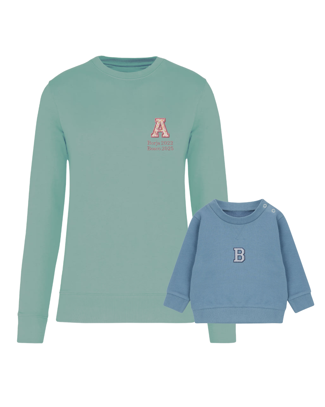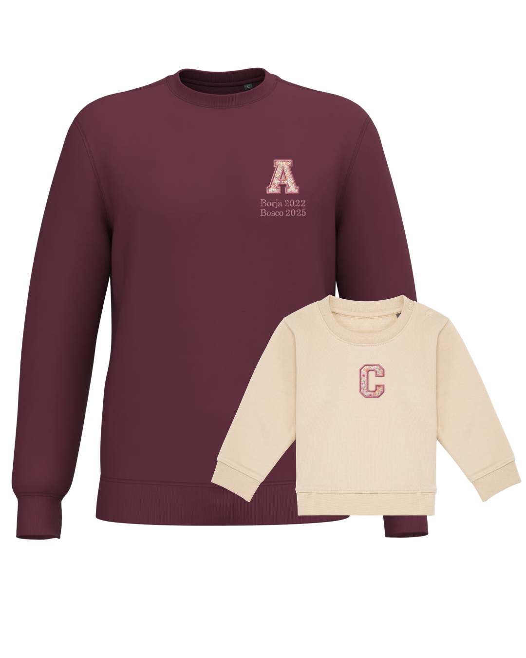 The embroidery is done on the left chest and back of the adult sweatshirt, and in the centre of the children's sweatshirt.