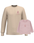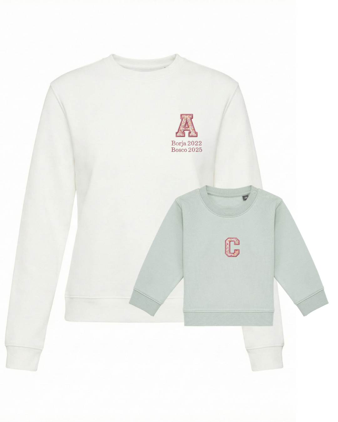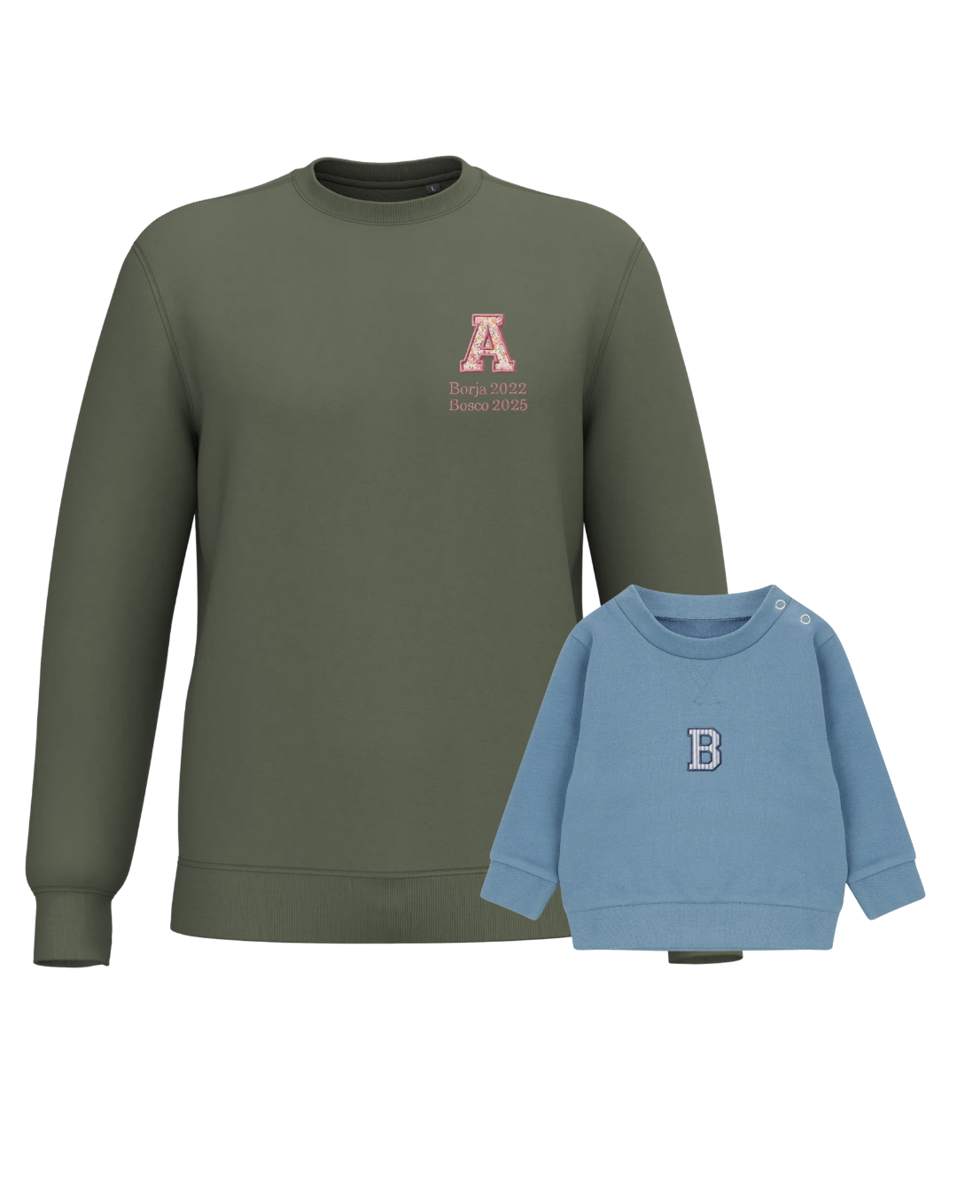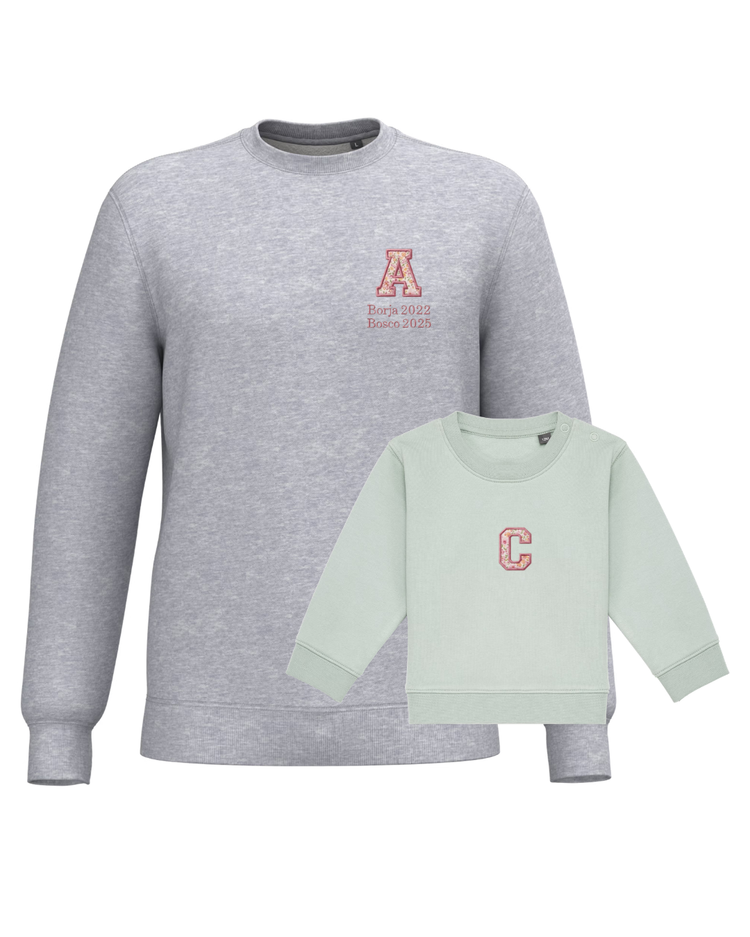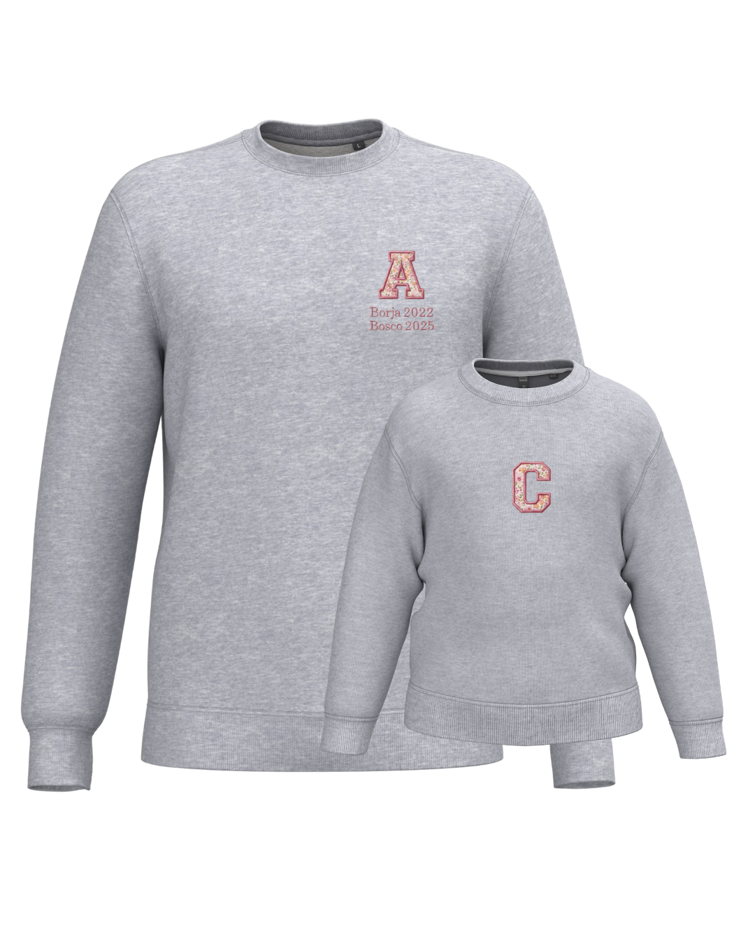 The embroidery is done on the left chest and back of the adult sweatshirt, and in the centre of the children's sweatshirt.