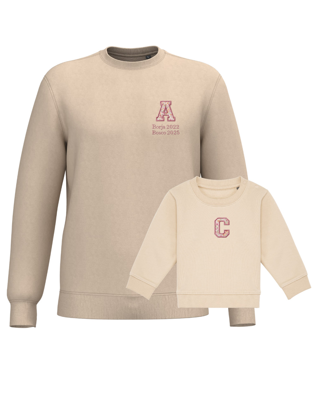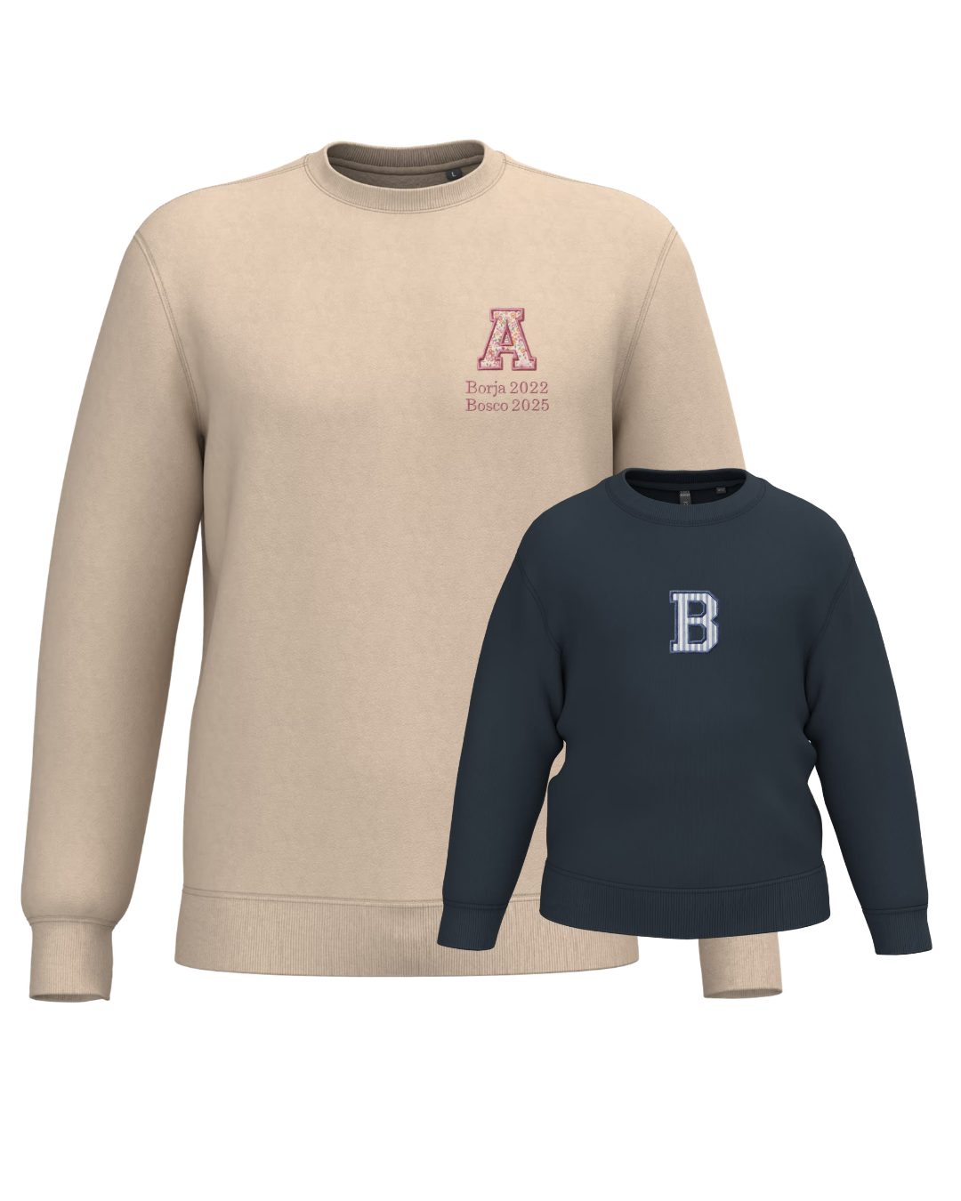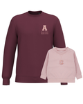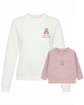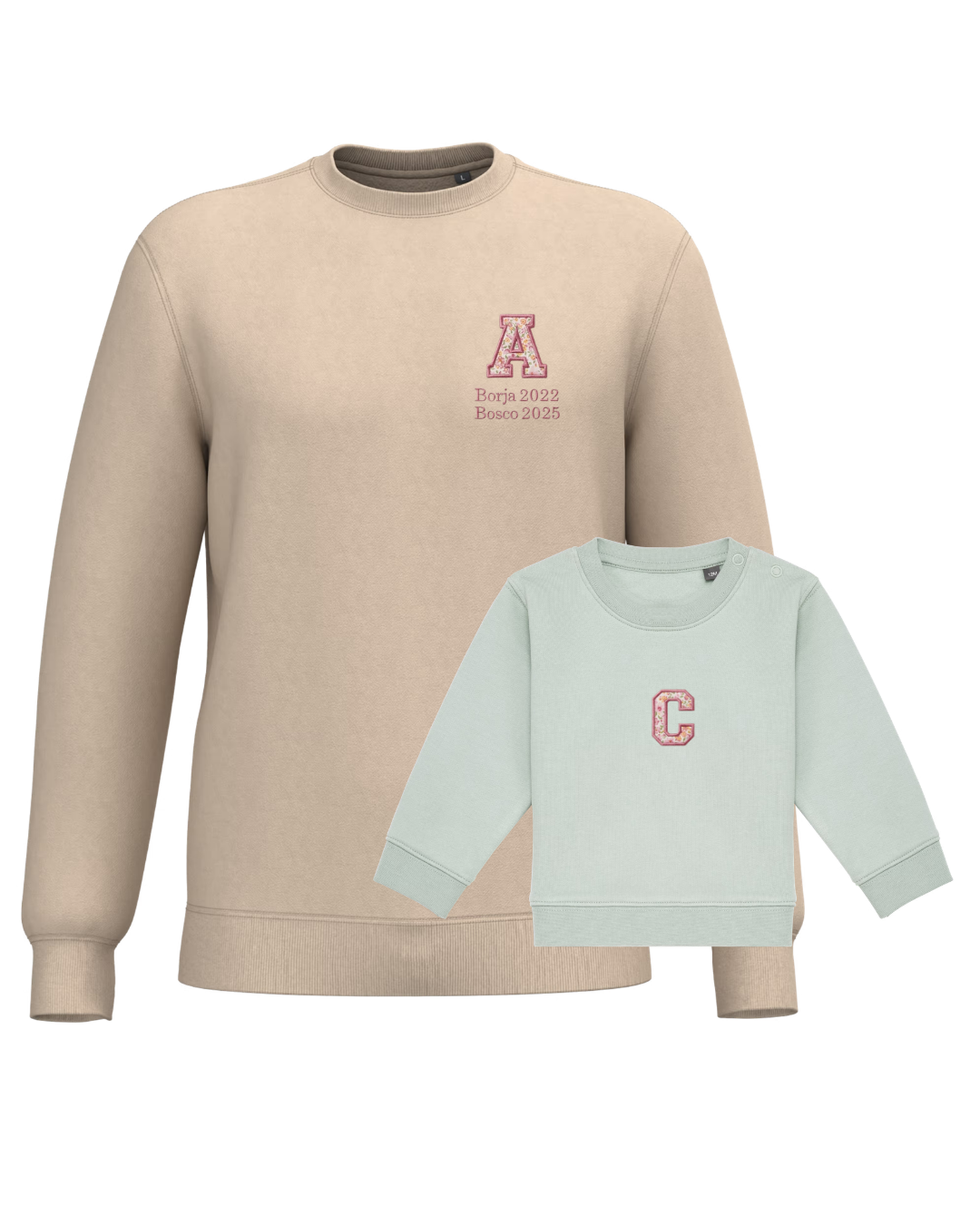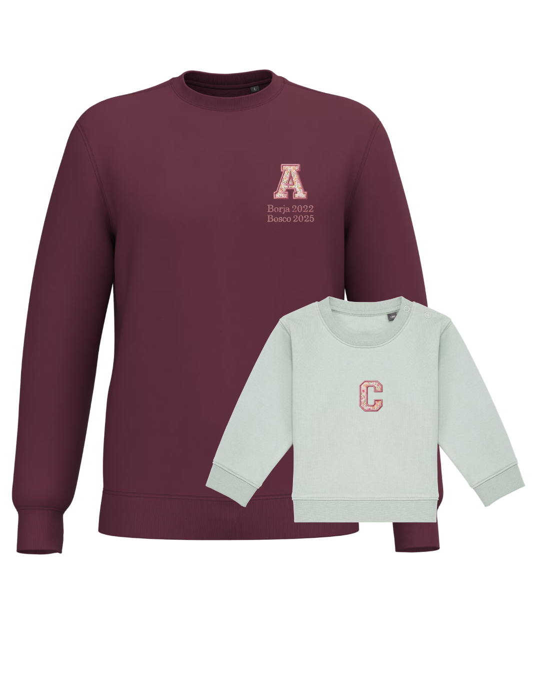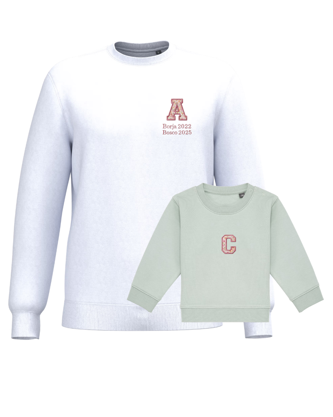 The embroidery is done on the left chest and back of the adult sweatshirt, and in the centre of the children's sweatshirt.