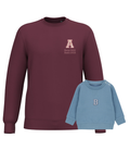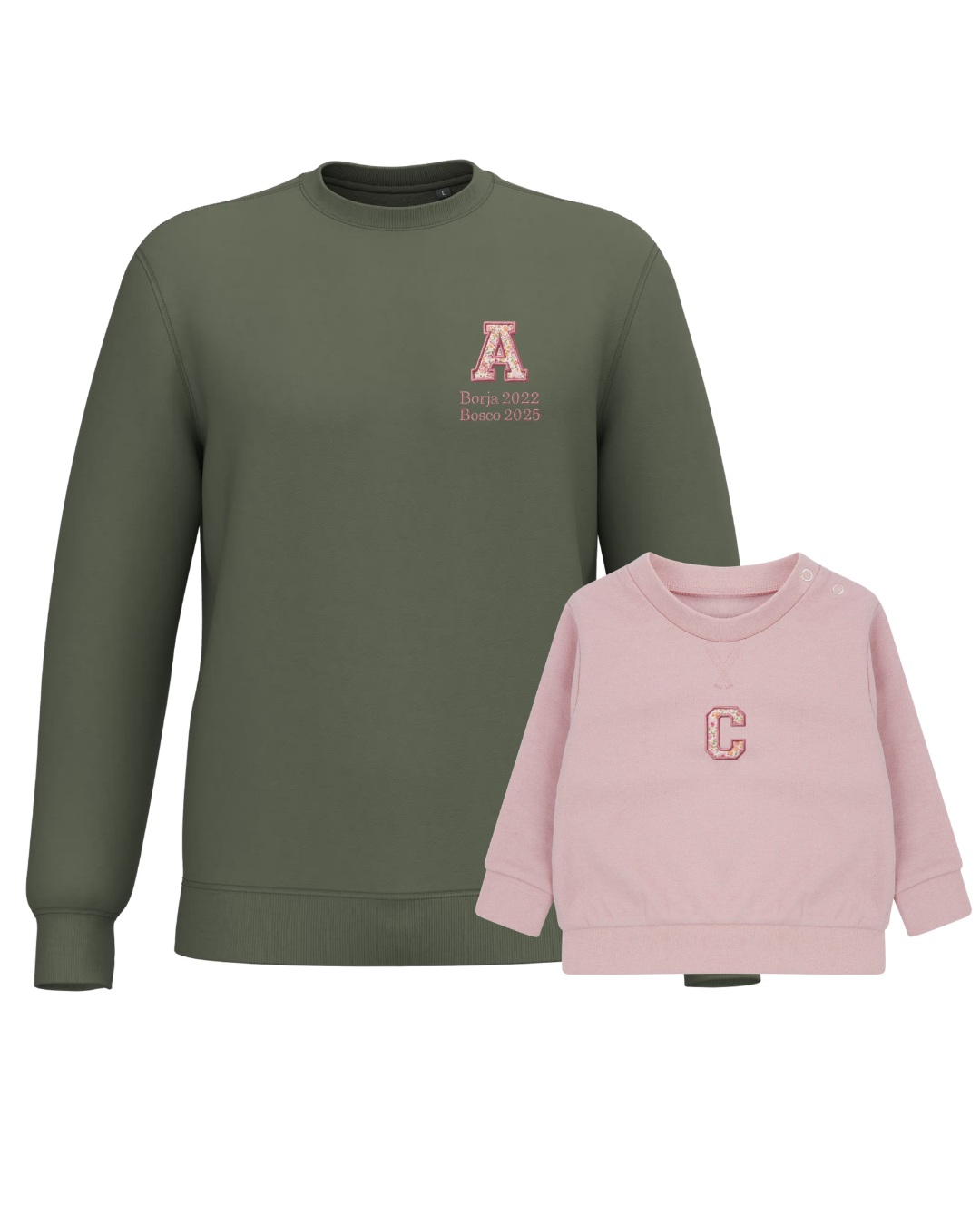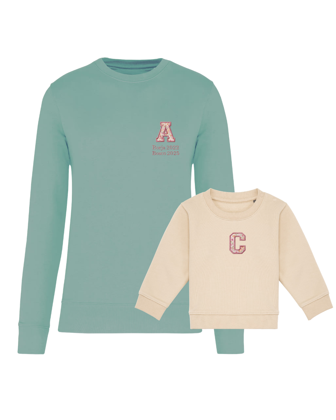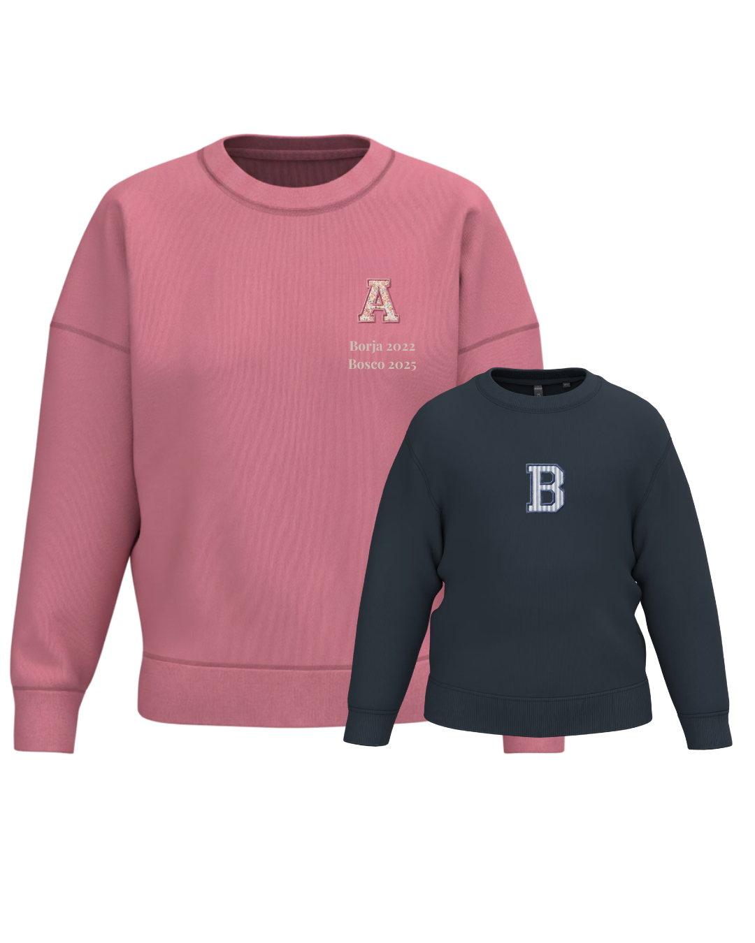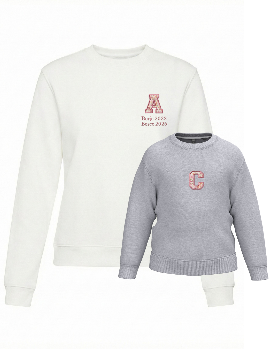 The embroidery is done on the left chest and back of the adult sweatshirt, and in the centre of the children's sweatshirt.