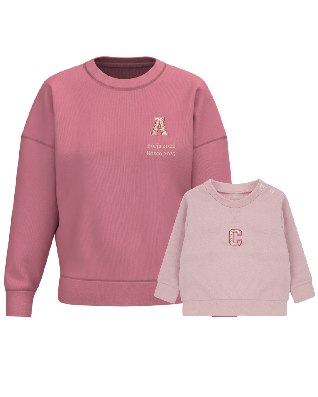 Each hoodie features an embroidered initial against a background of fuchsia flowers or blue stripes, and the mum’s hoodie also features a word or phrase.