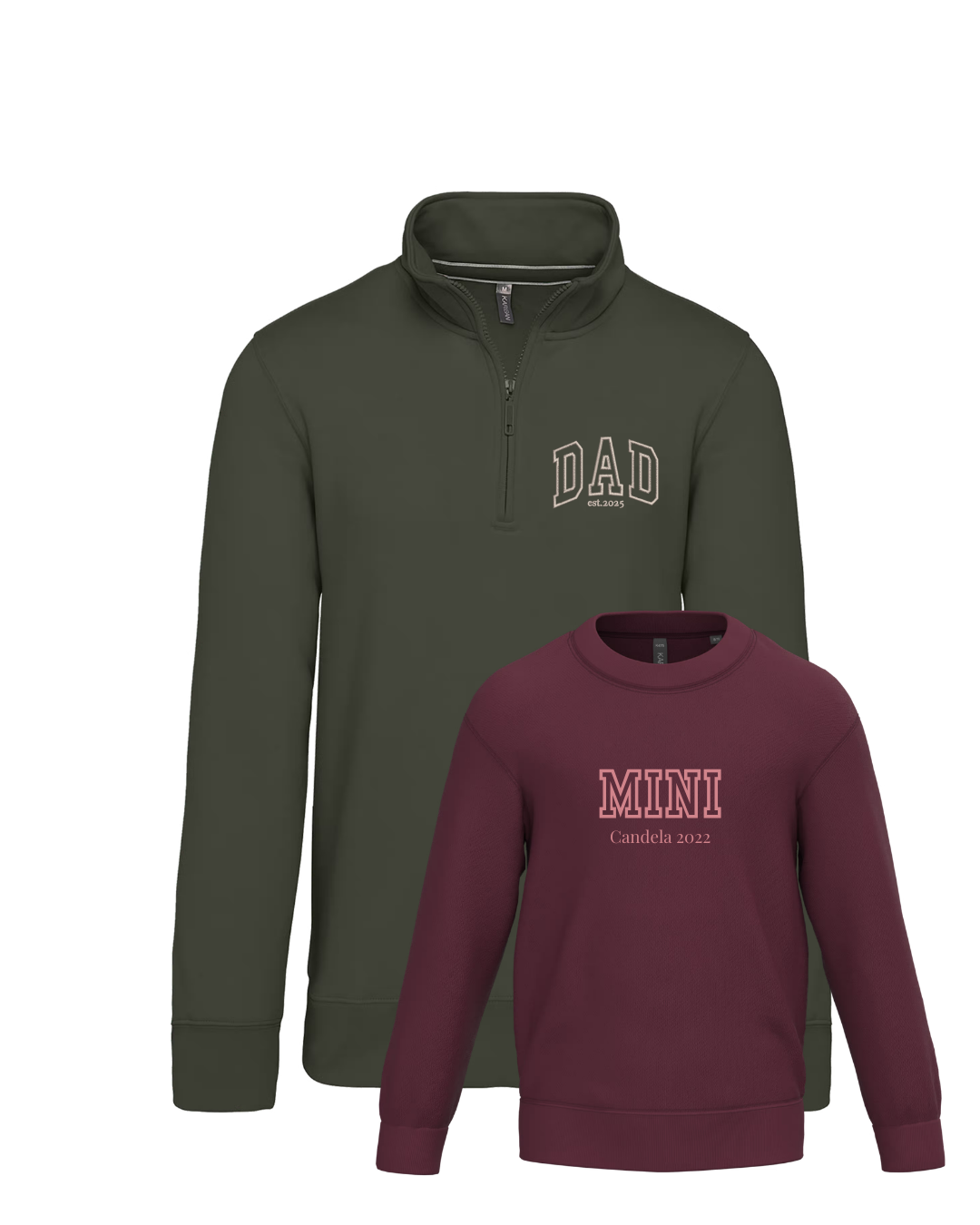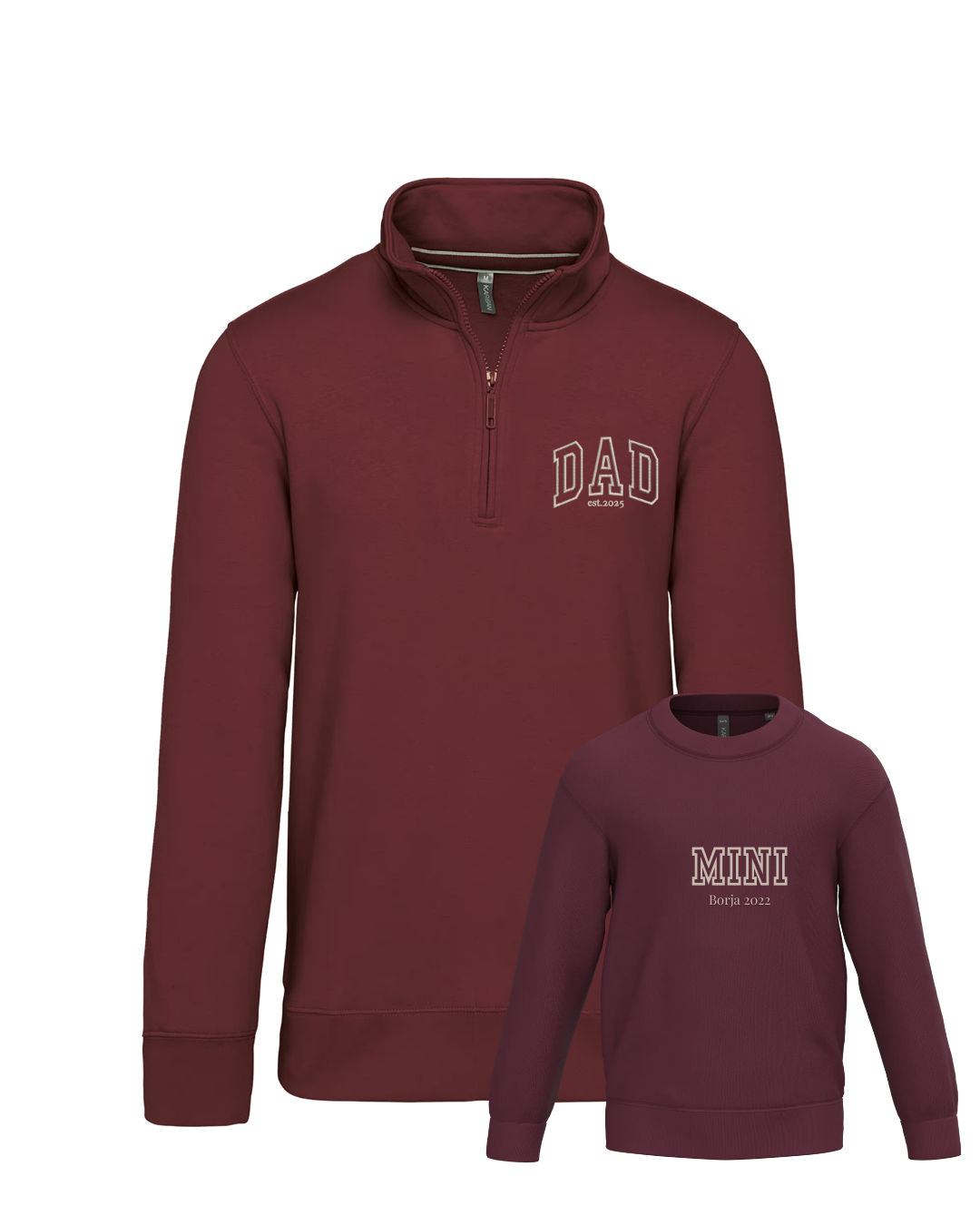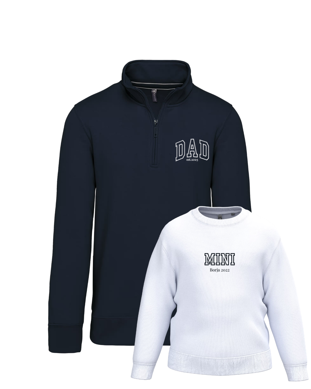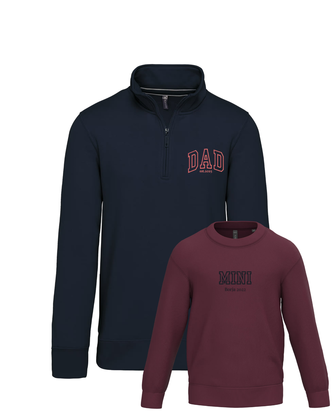 Each sweatshirt is embroidered individually with DAD and MINI and your chosen phrase.