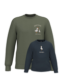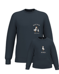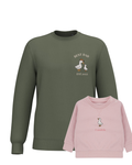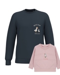 Personalised unisex sweatshirt with two ducks and two phrases (one above and one below). Personalised children's sweatshirt with a duck and a phrase below.