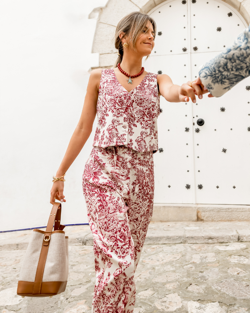 Straight ankle trousers in Toile de Jouy maroon fabric. It has a gummed back waistband for a better fit to your figure with a button fastening and two front pockets that stylise the leg.