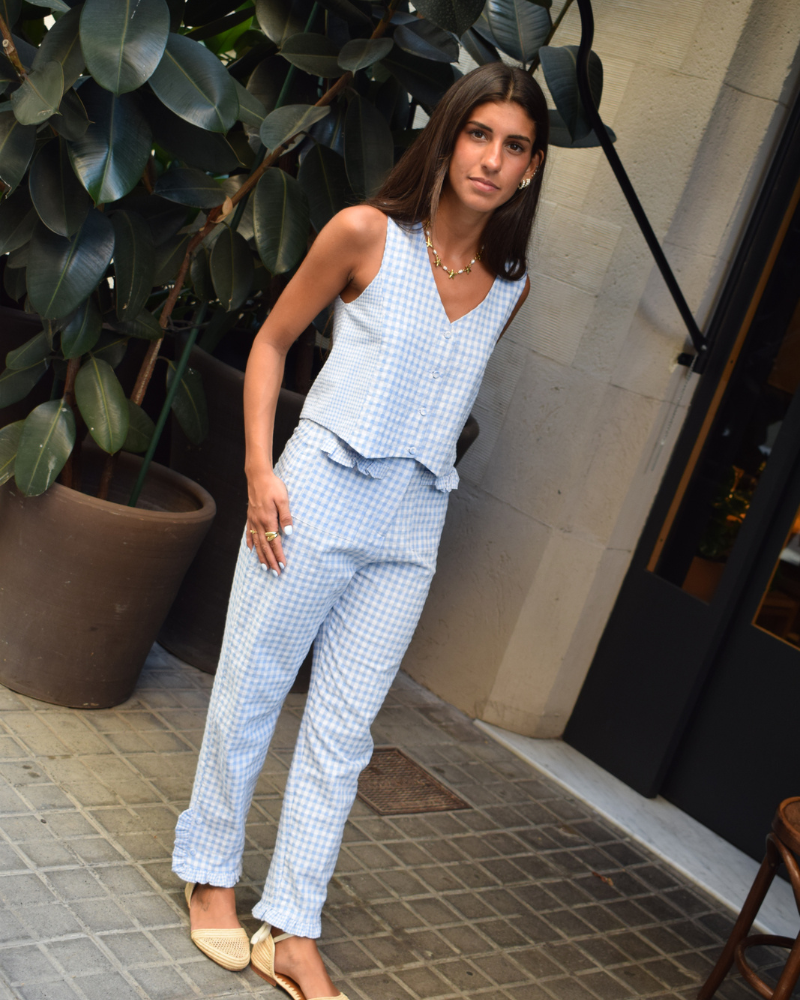 Straight ankle trousers in blue vichy fabric, made in a pleasant fabric. It has a waistband made in tone-on-tone vichy in a small size. The back of the waistband is gummed for a better fit to your figure. Button fastening and two front pockets with a small tone-on-tone vichy ruffle in a small size to make the leg look very slim. Finished with a ruffle and two small tone-on-tone vichy lined buttons at the bottom.