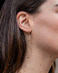 Earrings made up of a fine chain with coloured zirconia squares dangling from it.