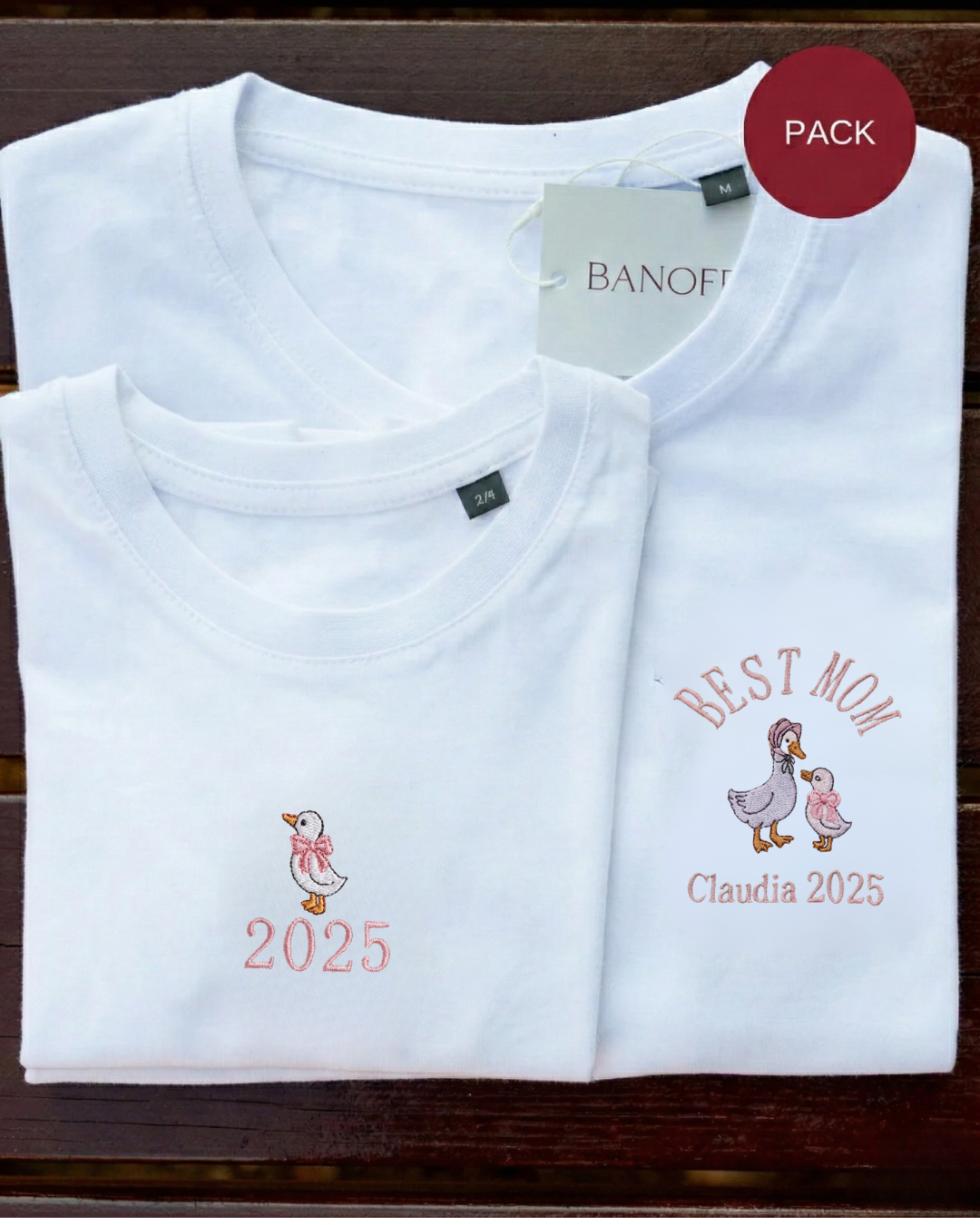- Personalised unisex T-shirt featuring a mum duck and one/two/three ducklings, with two phrases (one at the top and one at the bottom).