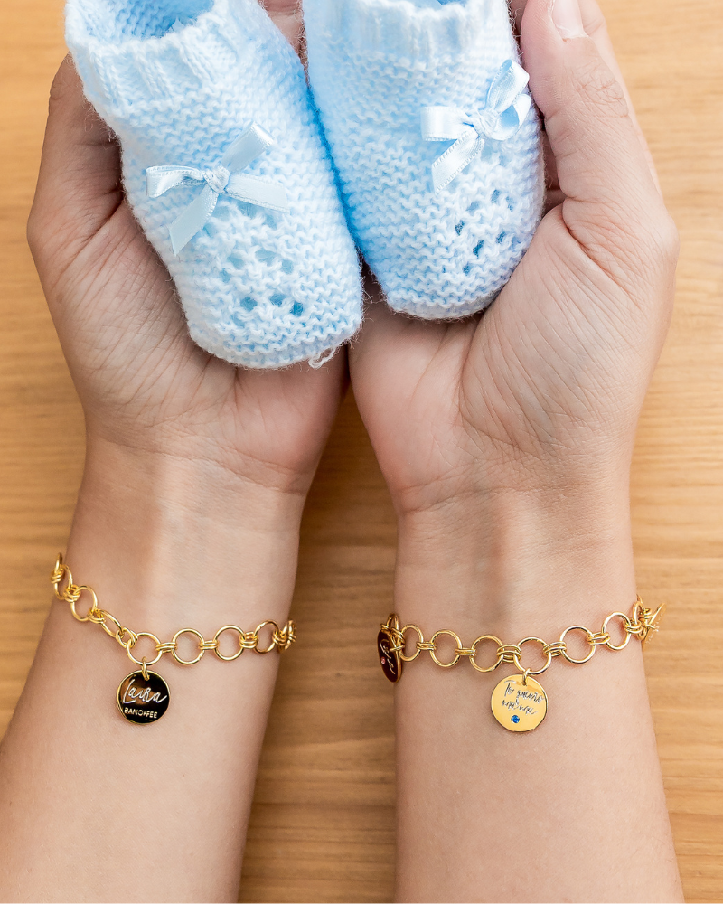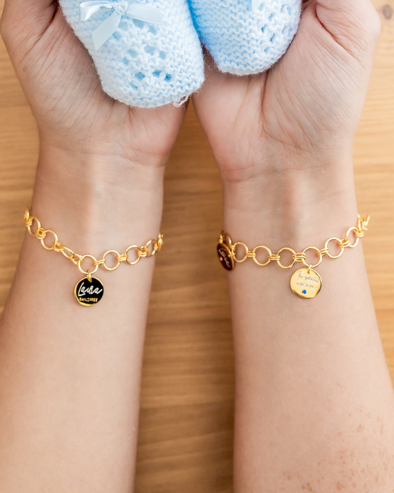 Round link bracelet with medals engraved with name or initials and dates or phrase.