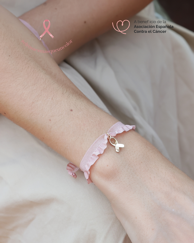 A bracelet designed by us and made in our workshop so that you can wear it every day as a symbol of your support in the fight against breast cancer. On this occasion, we have chosen the ribbon, a symbol of struggle and support, and a pale pink elastic band, as we want to support the Association's slogan: to restore the meaning of the colour pink in the fight against cancer. From 15 to 19 October 2025, we will donate all profits from sales of this item, both in physical stores and in our online shop, to the Cancer Association to support research into this disease.