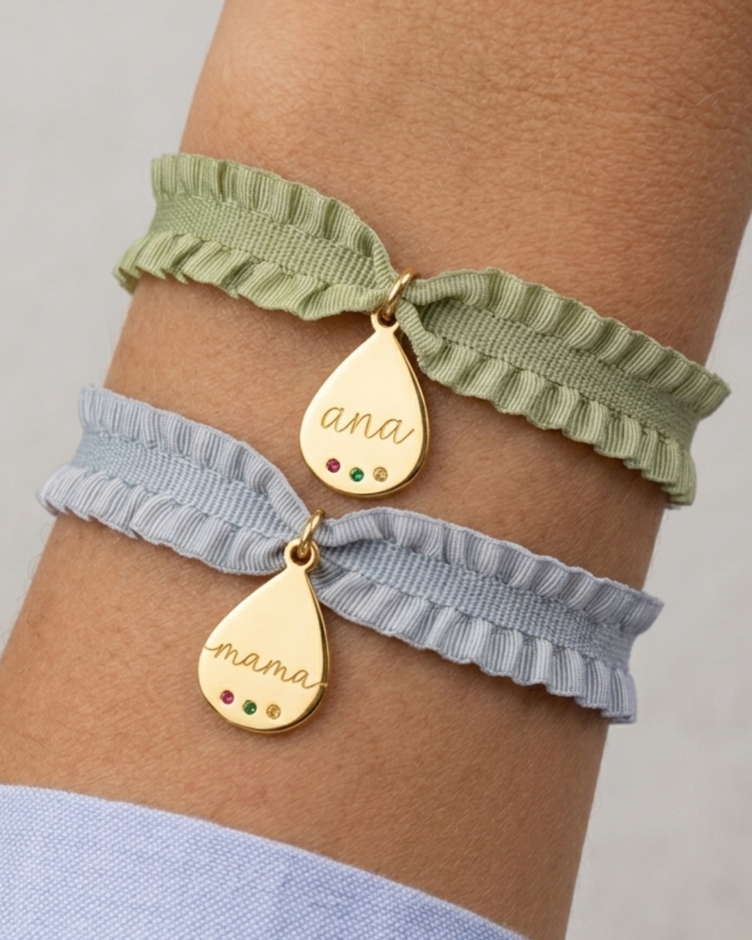 - Adjustable elasticated ribbon bracelet with a ruffle around the edge.