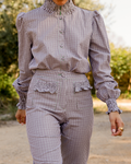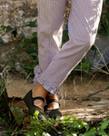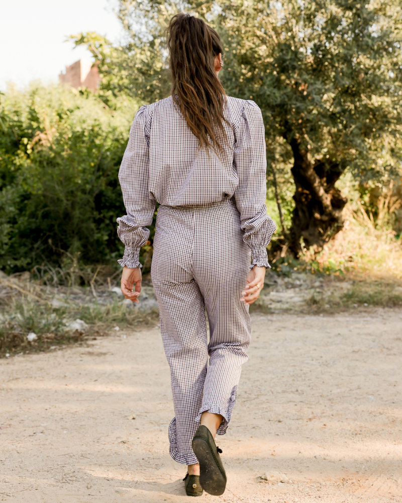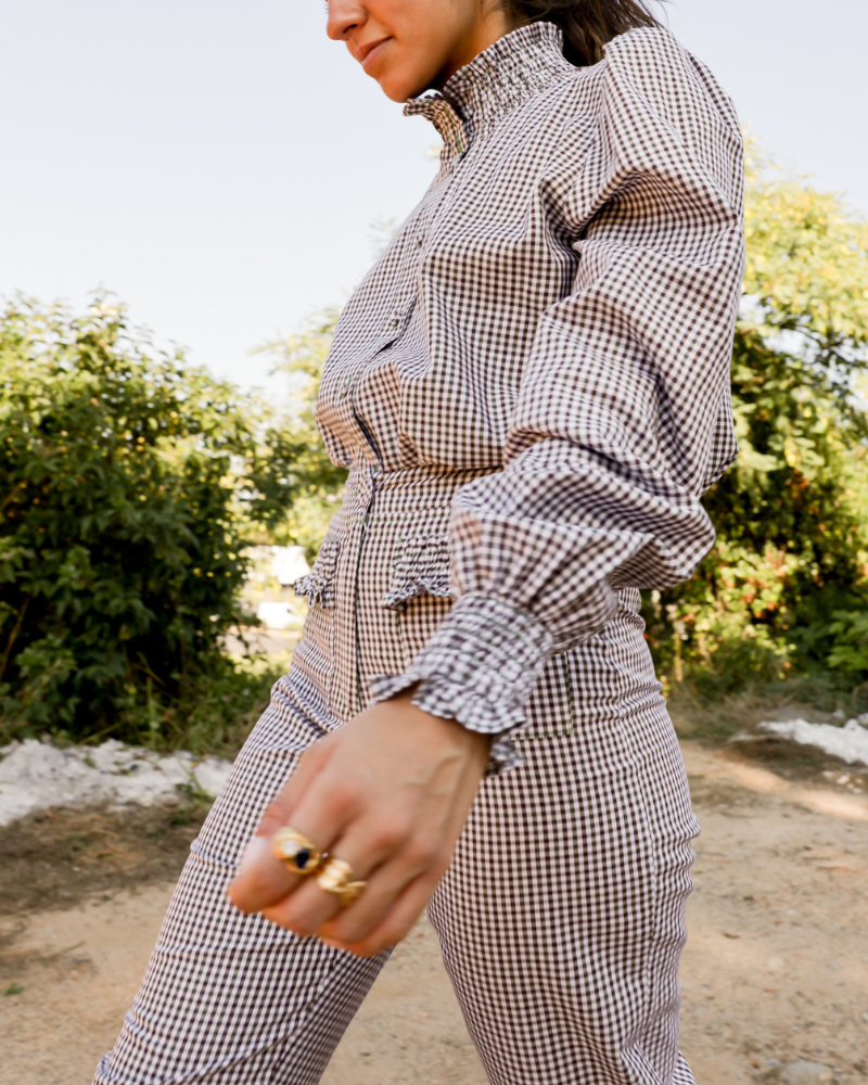 The outfit is made from a green and brown checked cotton fabric. The bottom is an ankle-length trouser with a ruffle at the hem and two covered buttons. It has a waistband that fastens with a covered button. It also has two front pockets with ruffles. The top is a button-down shirt with covered buttons and a gathered collar.