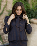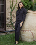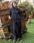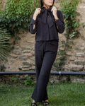 The set is made of bamboo cotton fabric in midnight blue with camel velvet stripes. The bottom part is a pair of ankle trousers. It has a waistband that closes with a lined button. In addition, it has two front pockets with ruffle. And, on the upper part, it has a shirt buttoned from top to bottom with lined buttons and a collar with a bow.