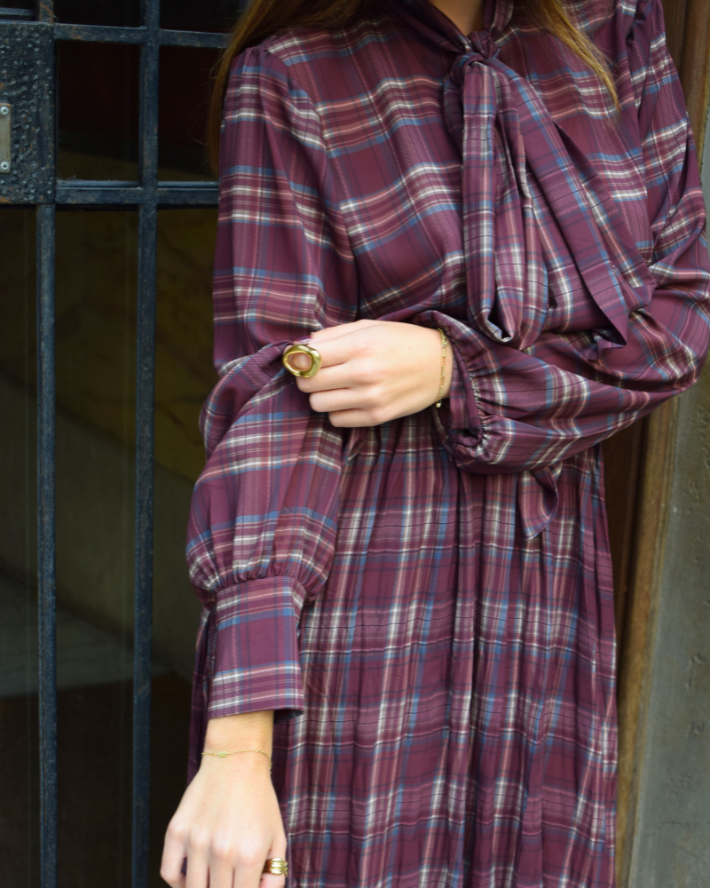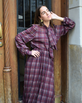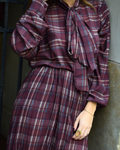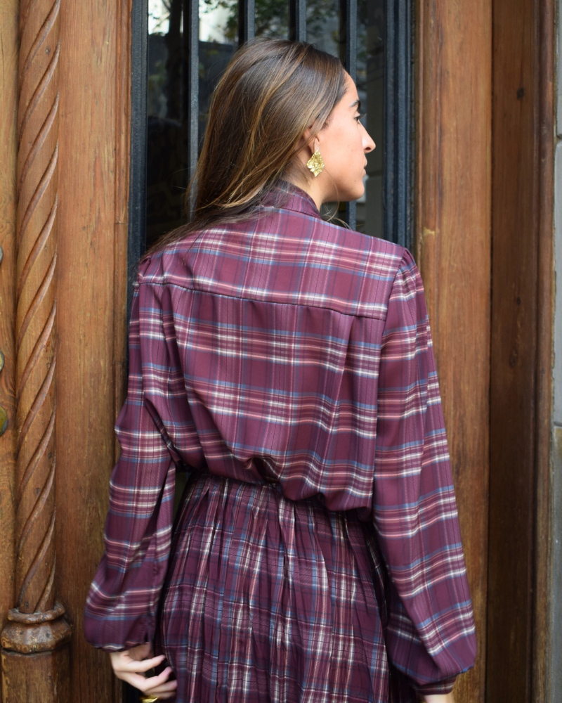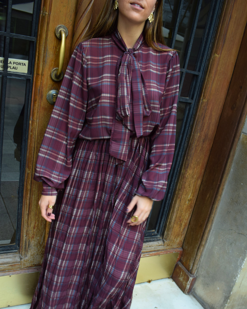 Checked fabric outfit with a maroon background. The top is a high-necked shirt with a tie. Buttoned from top to bottom. Long puffed sleeves and cuffs that tie with buttons. The bottom is a full skirt with an adjustable elastic waistband.