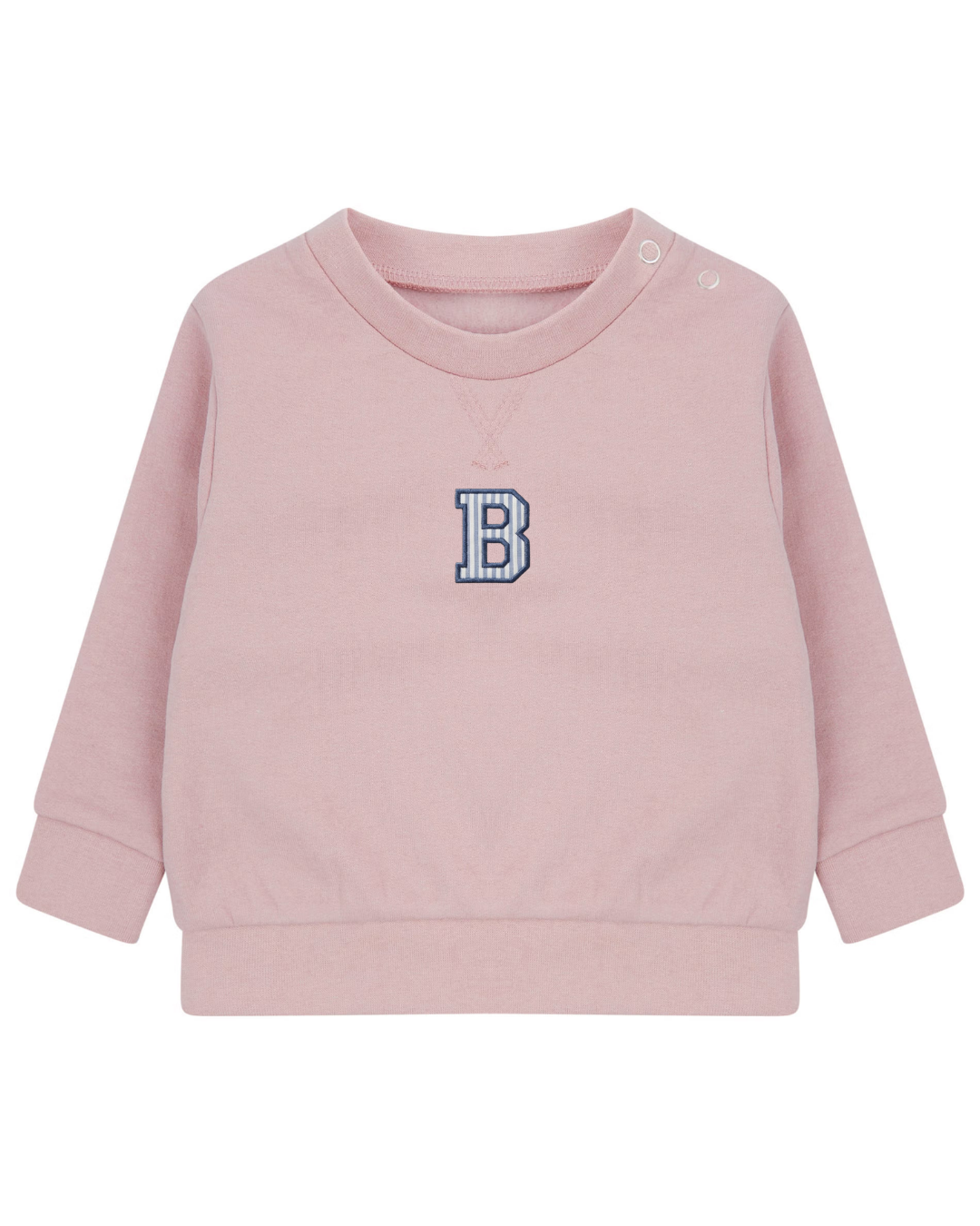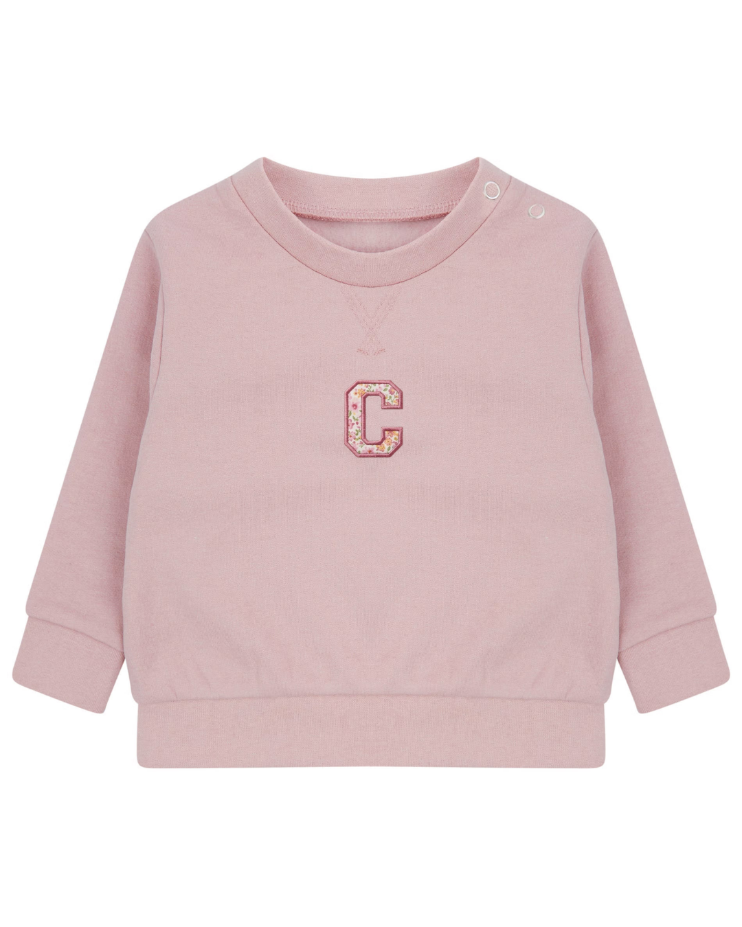 This sweatshirt is personalised with a pink floral initial or blue stripes in the centre, creating a unique garment, made especially for little ones.