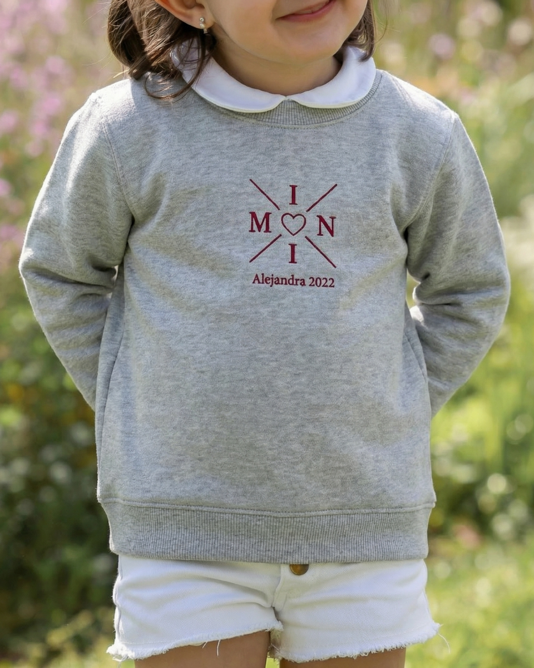 - Personalised grey boys' sweatshirt featuring a cross with a heart in the centre and the word “MINI”, with a phrase underneath.