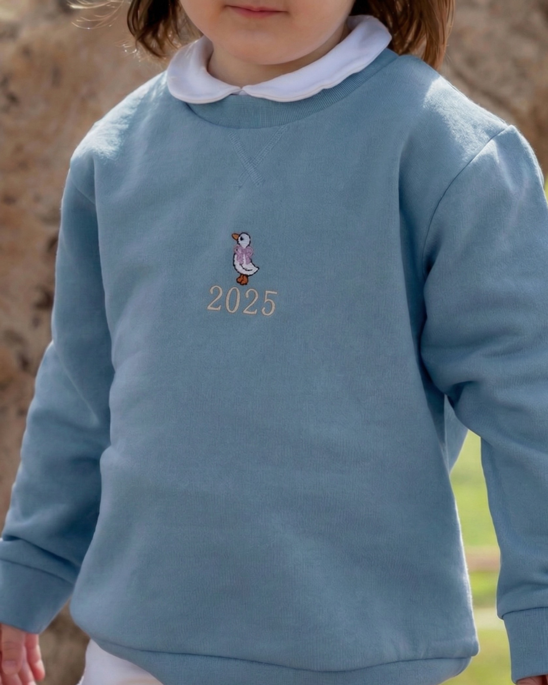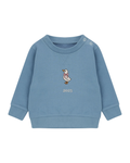 - Personalised blue boys' sweatshirt featuring an embroidered duck with a bow and a slogan.