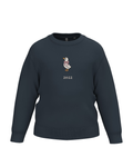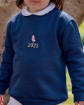 - Personalised navy blue boys' sweatshirt featuring an embroidered duck with a bow and a slogan.