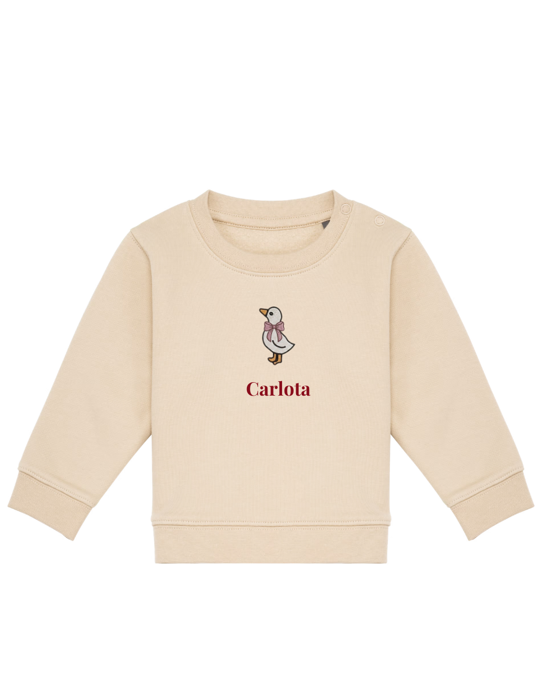 - Personalised beige boys' sweatshirt featuring an embroidered duck with a bow and a slogan.