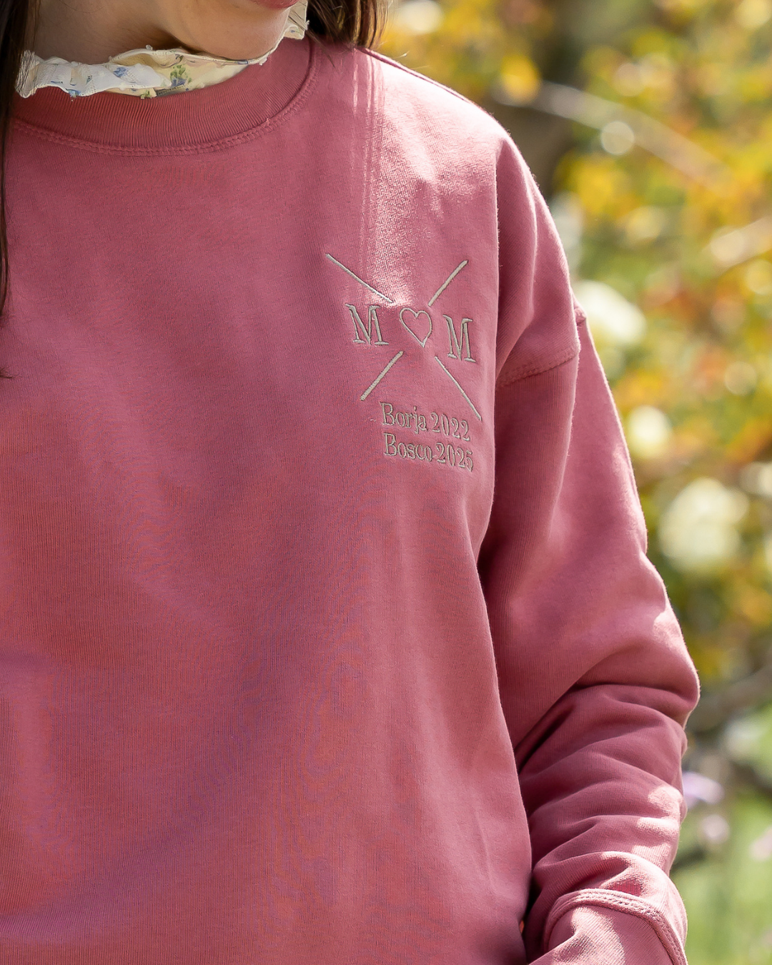 This sweatshirt is customised with a cross and a heart in the middle – the ‘O’ in the word ‘MOM’ – along with a phrase or name (below the cross) on the left chest, creating a unique garment made especially for you.