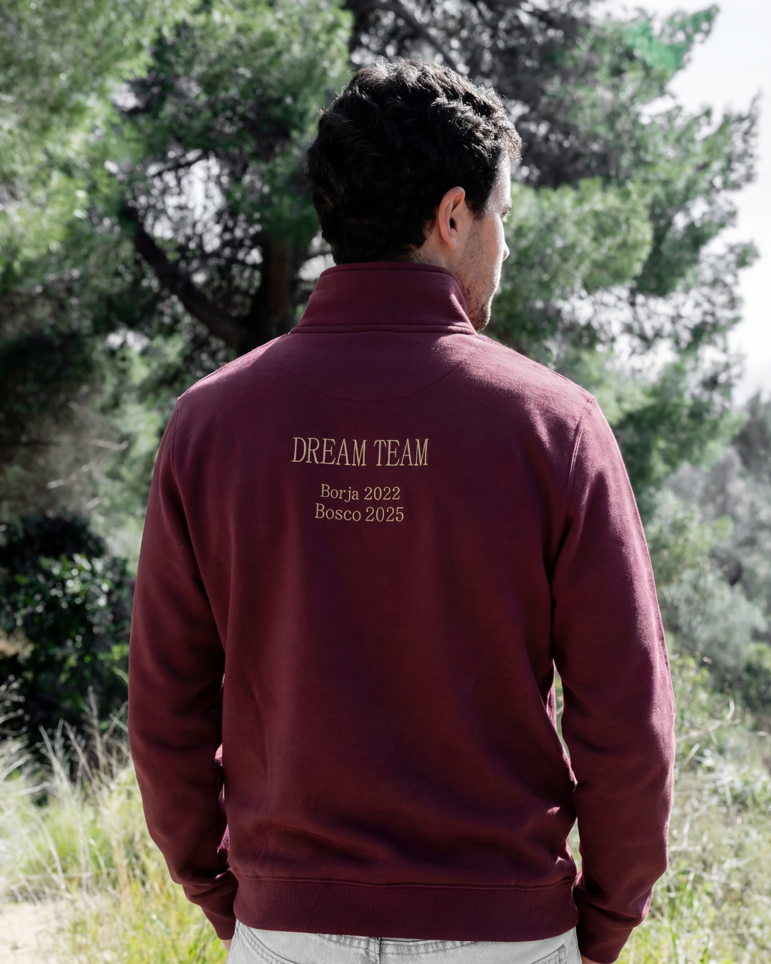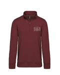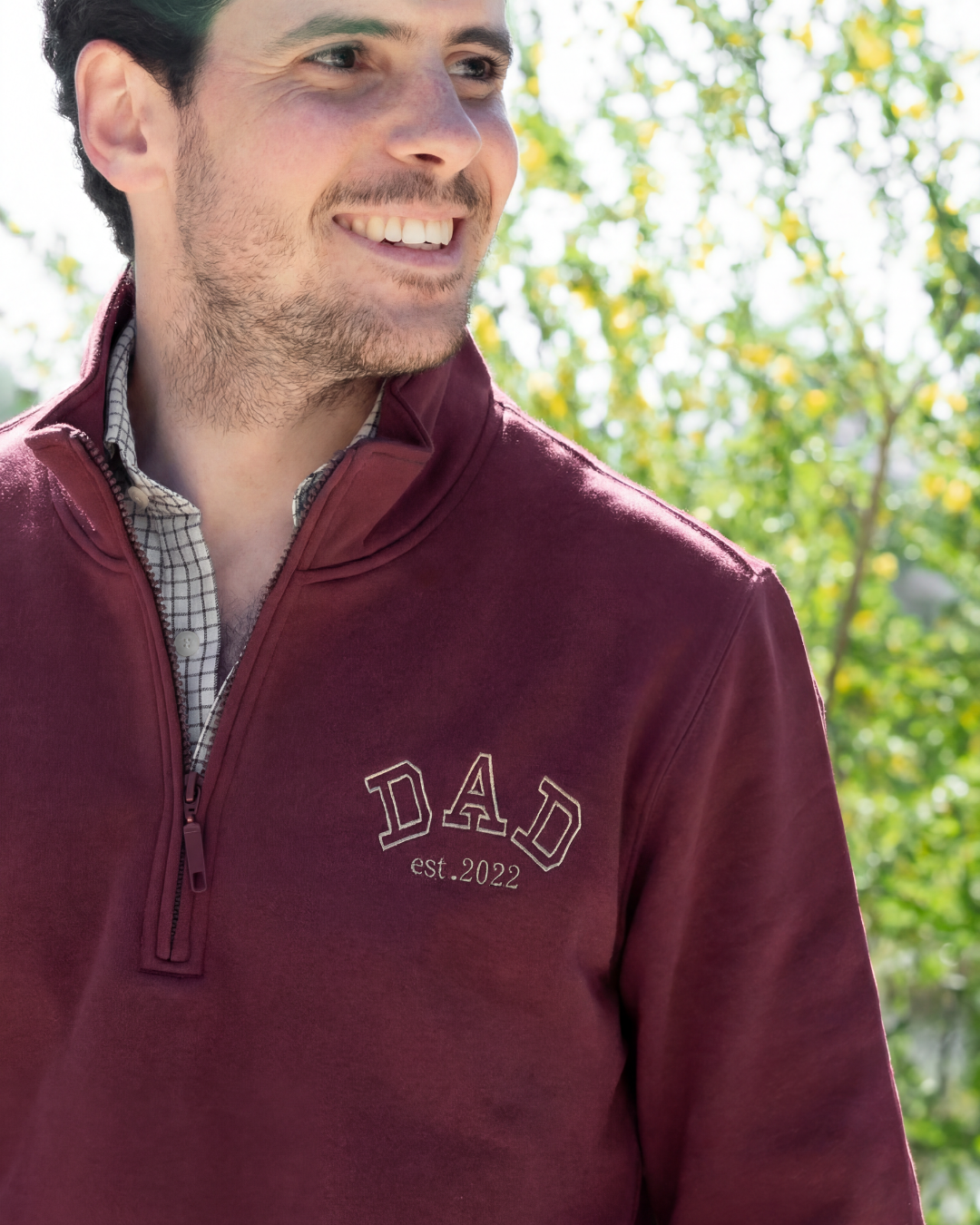 - Personalised maroon zip-up sweatshirt with the word DAD embroidered in bold letters and two phrases (one on the front and one on the back).