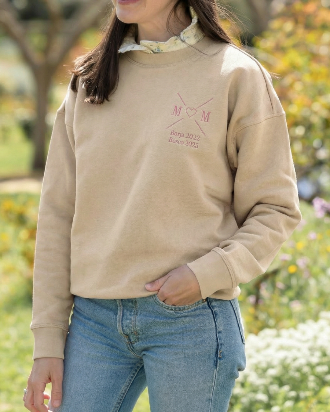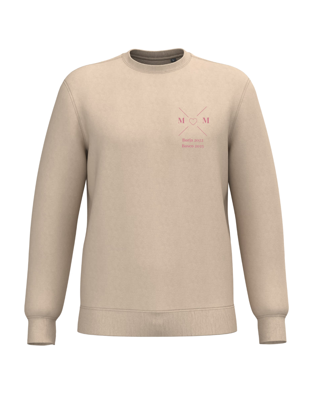 This sweatshirt is customised with a cross and a heart in the middle – the ‘O’ in the word ‘MOM’ – along with a phrase or name (below the cross) on the left chest, creating a unique garment made especially for you.
