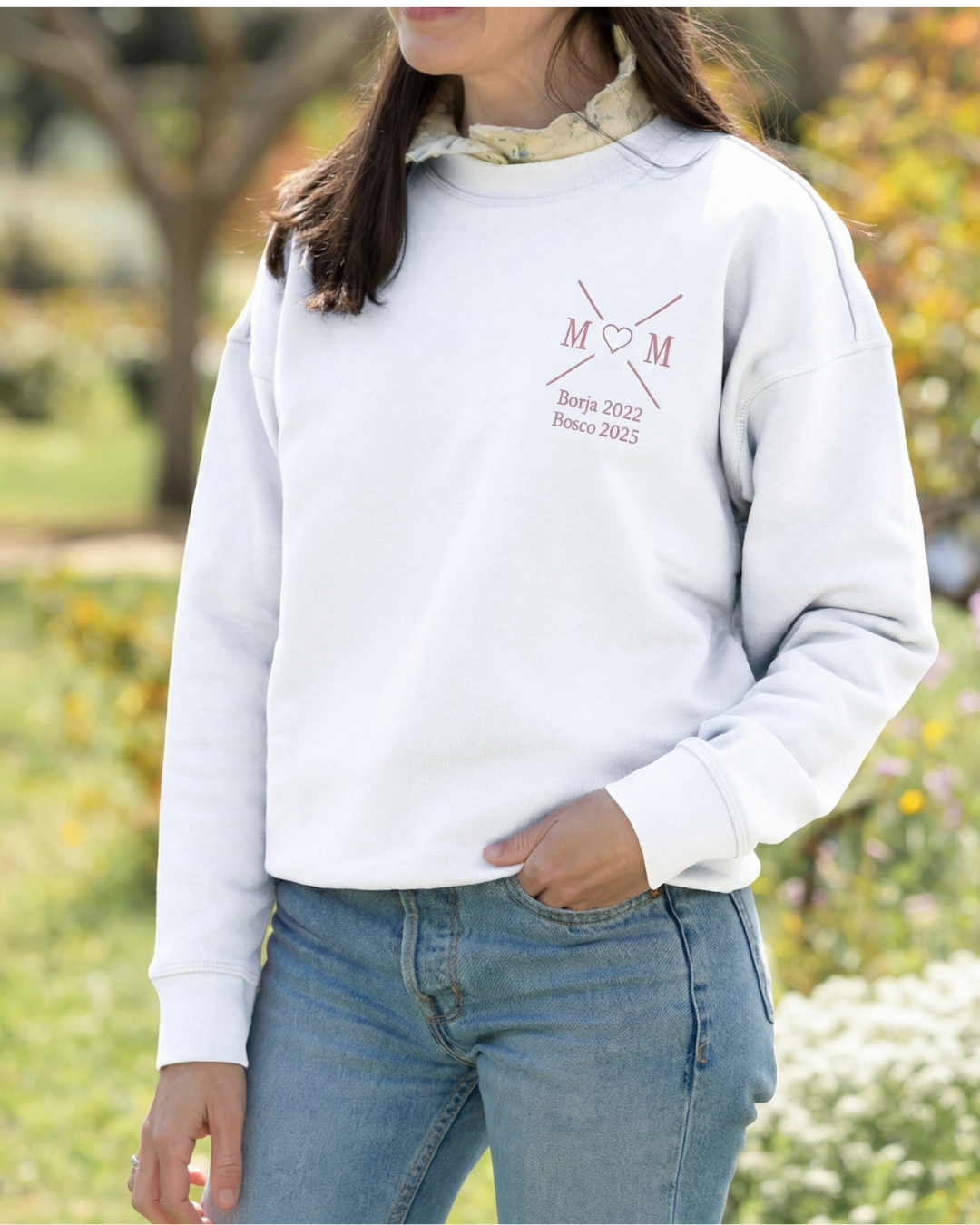 This sweatshirt is customised with a cross and a heart in the middle – the ‘O’ in the word ‘MOM’ – along with a phrase or name (below the cross) on the left chest, creating a unique garment made especially for you.
