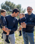 This sweatshirt is personalised with two ducks and two phrases or names (above and below the ducks) on the left chest, creating a unique garment made especially for you.