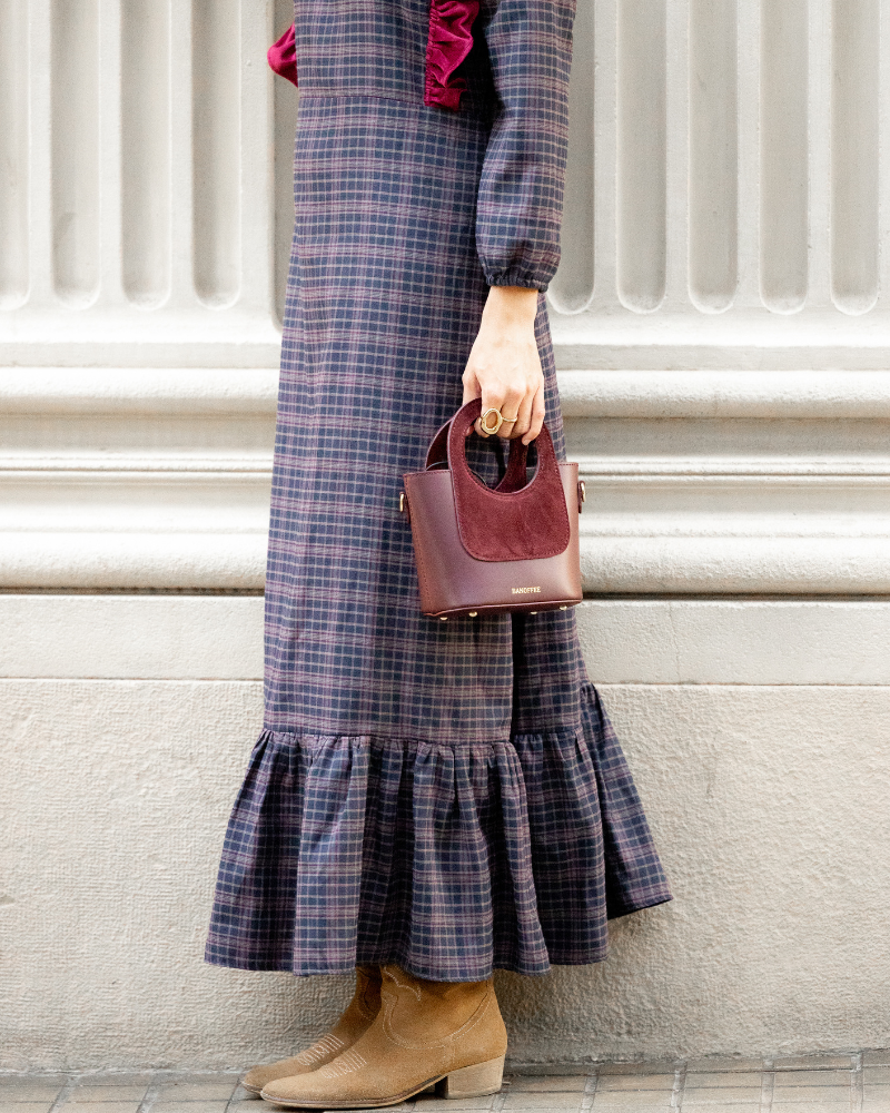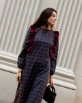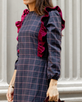 Checkered fabric dress with maroon velvet ruffles on the front that continue down the back. Round neckline and puffed sleeves finished with cuffs. Buttoned at the back of the neck.