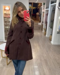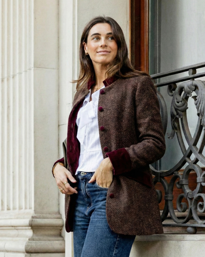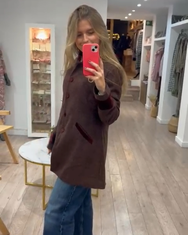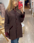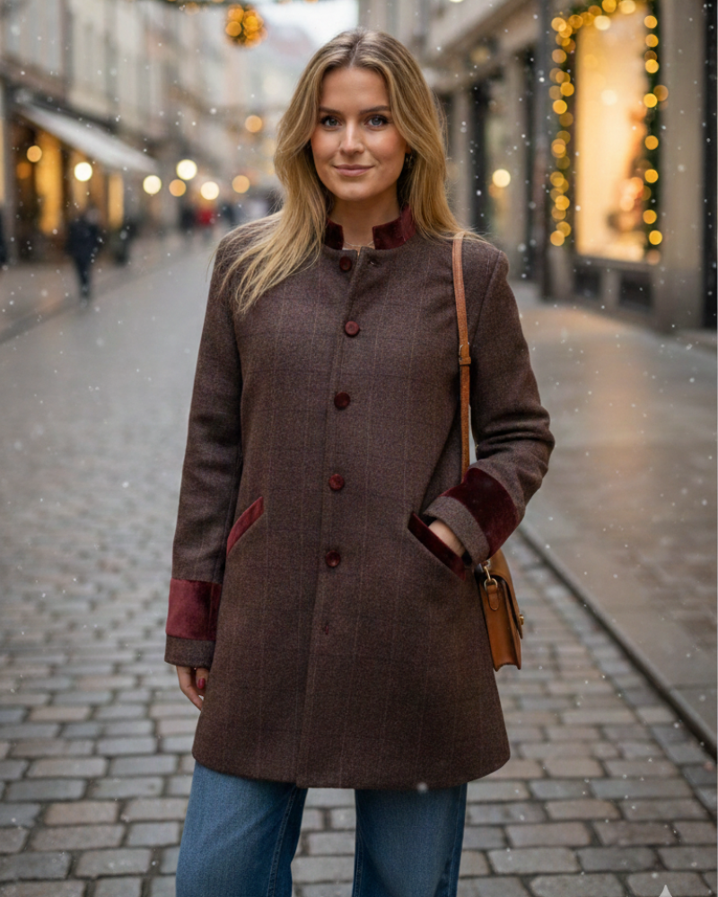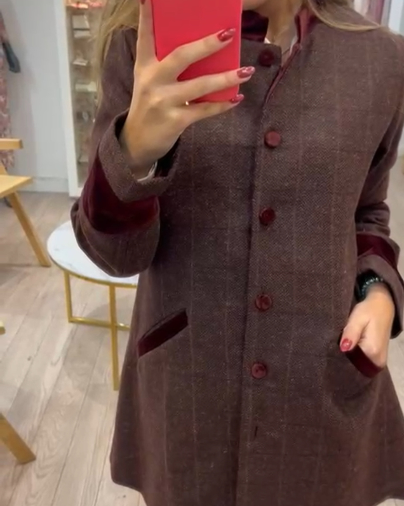 Abrigo de tejido de cuadros en tono marrón. Abotonado de arriba a abajo con botones forrados de terciopelo granate. Forro interior en color granate. Lleva una solapa interior forrada en terciopelo granate a juego con los detalles del cuello, las mangas y los bolsillos.