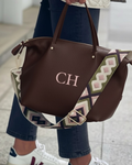 Cuenta con dos asas pequeñas fijas de piel marrón y una correa regulable de piel marrón por si lo quieres usar de bandolera (2cm de ancho). NO INCLUYE ASA BANDOLERA ÉTNICA (se tiene que coger a parte).