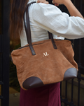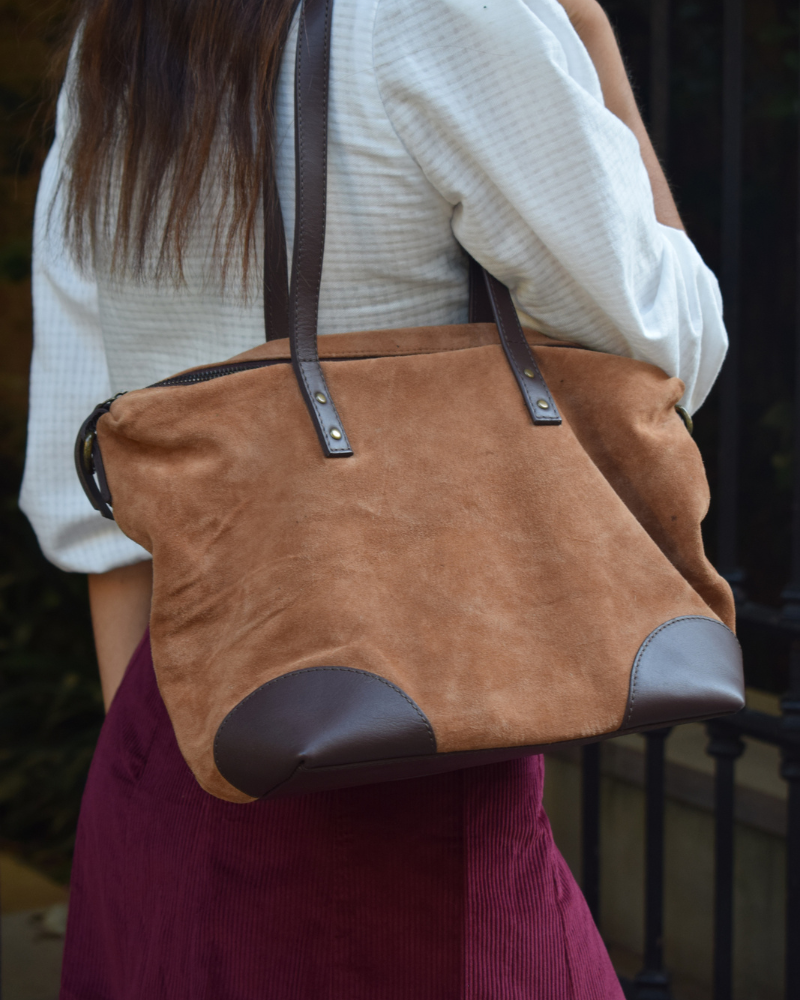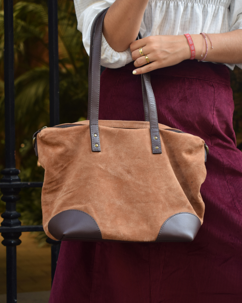 Confeccionado en ante de origen vacuno en color camel con base esquinera confeccionada en piel marrón y asas largas a juego. Un básico atemporal que nunca pasará de moda.