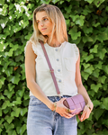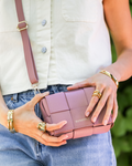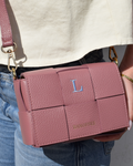 Bolso bandolera con entrelazado ancho en color rosa antiguo de piel de vacuno. Cuenta con una asa bandolera para colgártelo del hombro o cruzártelo.