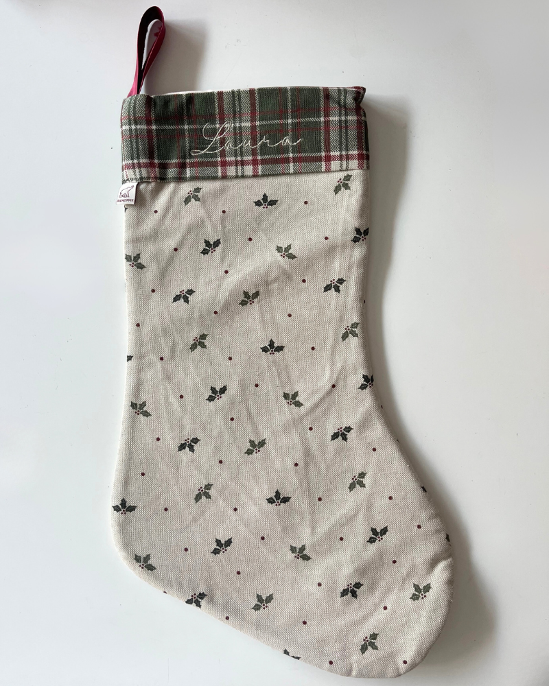 Adorno decorativo de Navidad, de algodón personalizado, en forma de calcetín. Combinado en dos tejidos con una cinta de lazo para colgar.