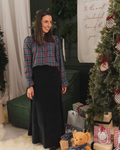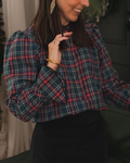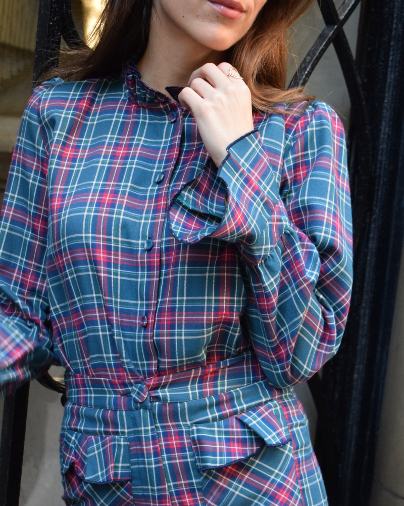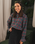 Camisa de tejido escocés turquesa y granate. Abotonada de arriba abajo con mini volante en el cuello. Manga larga un poco abullonada acabada en volante.